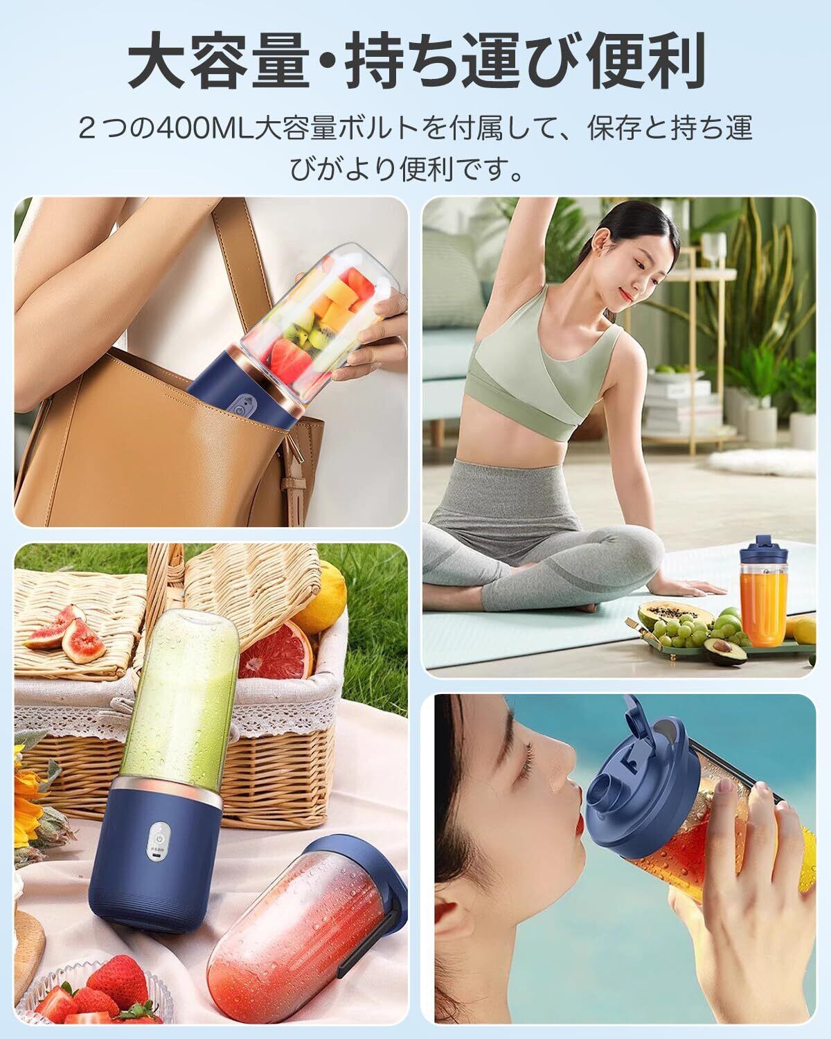 【Type-C充電式&大容量ボトル】ミキサーには長時間使用可能なリチウムイオン電池を内蔵し、スマホ充電器、車載充電器やモバイルバッテリーなどで簡単に充電できます。400 MLのボトルが2つ付属しており、1-2人分の使用に最適です。自宅、学校、オフイス、キャンプ、アウトドア、ジムなど幅広いシーンで活躍してくれるのが魅力です。