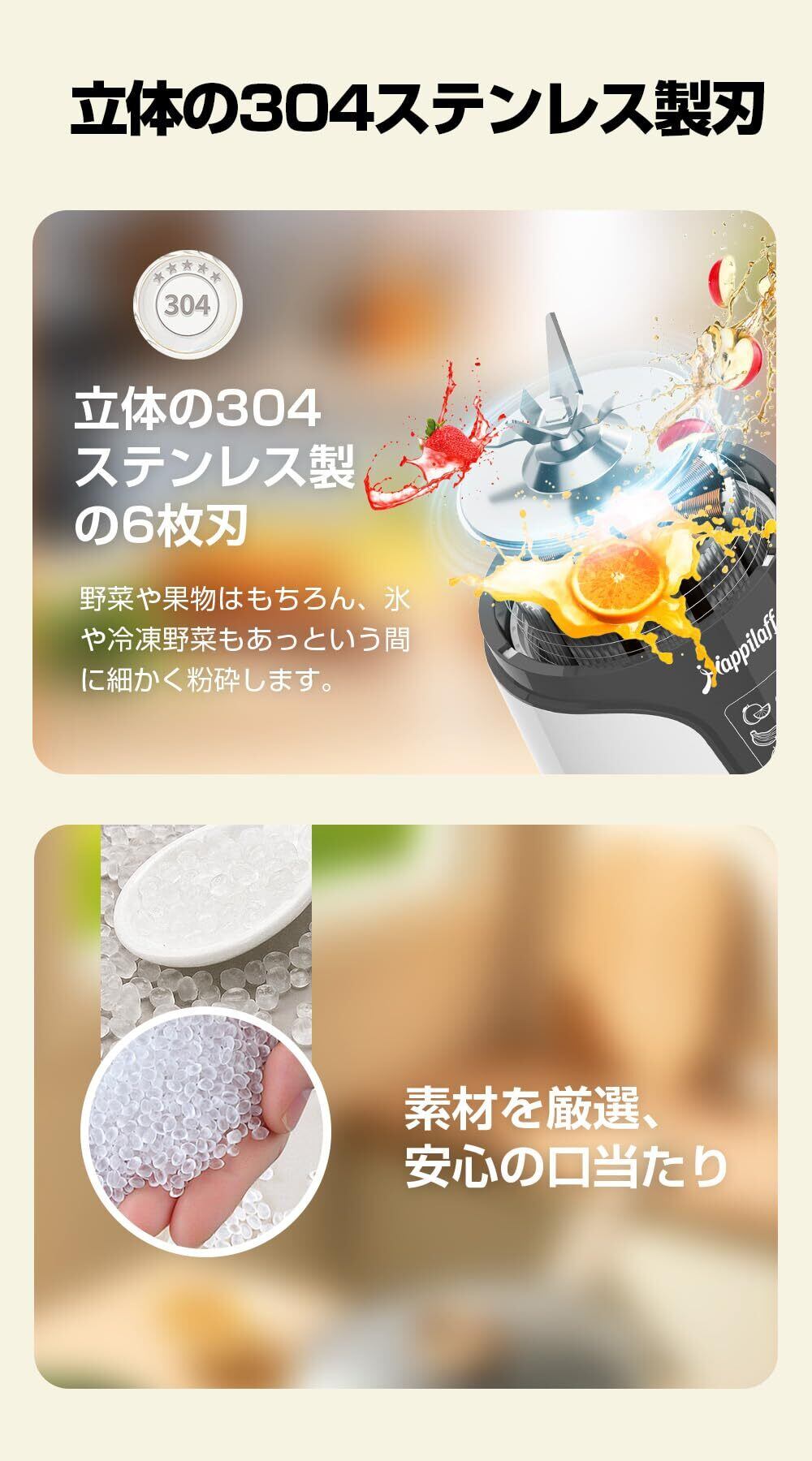 【立体の304ステンレス刃・操作簡単・安定感あり】304ステンレス製高強度波型6枚刃カッターを採用し、鋭い切れ味、時間と手間を賢く省く。野菜や果物はもちろん、氷や冷凍野菜もあっという間に細かく粉砕。余計な機能やスイッチはない、ロッグ以後ワンプッシュは稼働開始。誰でも簡単にジュースなどを作ることができ。忙しい朝にもしっかり栄養補給。足元は四つの吸盤あり、作業台にぴったりと貼り付き、底面の滑り止める。使用時も振動や騒音を軽減し、吸力が強いので安定感がある。