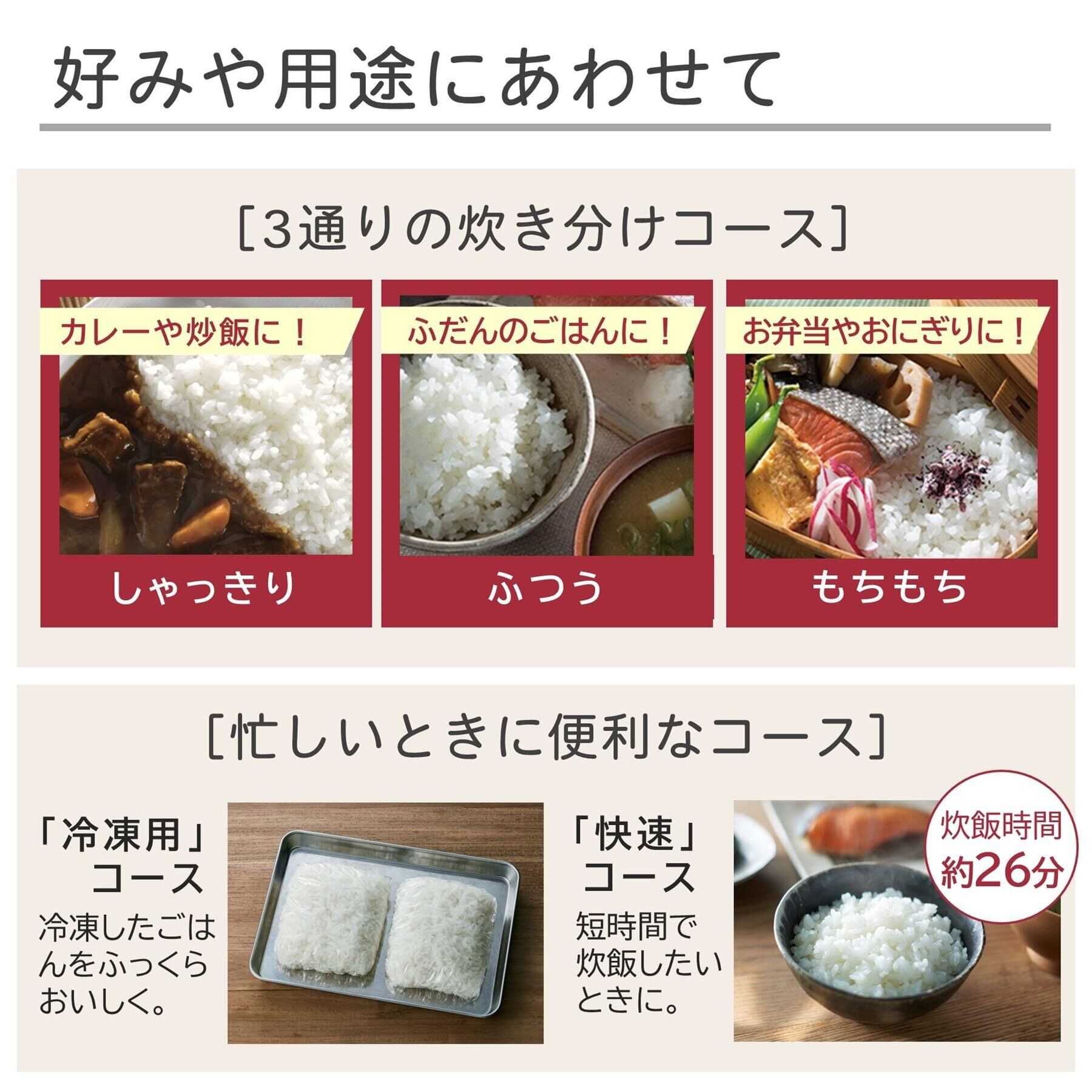 【炊飯メニュー】用途にあわせて3段階に炊き分け「炊き分け」コース ●しゃっきりコース あっさりとした食感に(カレーや炒飯に!) ●ふつうコース 甘みと粒感をひきだす(ふだんのご飯に!) ●もちもちコース より粘りがある(お弁当やおにぎりに!) ●冷凍用コース 冷凍したごはんをっふくらおいしく ●快速コース 時間のない時に便利です。白米(3合)を約26分で炊飯します。