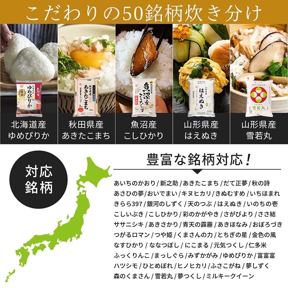 こだわりのデザインが、毎日を楽しくさせてくれる。1台で多彩な調理が楽しめる炊飯器です。炊飯はもちろんのこと、低温調理をしたり、パンやケーキを焼いたりすることも可能です。お米本来の旨みを逃さず、ご飯をさらに美味しく炊きあげる炊飯メニュー◆ お好みや料理に合わせて選べるかたさと食感かたさと食感を自由に掛け合わせる「おこのみ炊き」で9通りの炊き分けが可能。◆ こだわりの「50銘柄炊き分け」豊富な銘柄対応! 特徴に合った最適な火力と時間で、旨さを引き出し炊き上げます。◆ 「極厚火釜」がごはんをムラなく、ふっくら炊き上げる熱伝導性の高いアルミ層で、熱まわりの良い複層構造。お米一粒一粒にしっかり熱を伝え、ふっくら炊き上げます。◆ 料理に合わせて選べるお米の炊き上がり6つのモードから選ぶだけ。料理に合わせた、こだわりの炊き上がりに。手軽に健康生活「ヘルシーメニュー×低温調理機能搭載」で多彩なメニュー◆ 充実したヘルシーメニュー6種のヘルシーメニュー搭載で、健康サポート。健康ご飯を美味しく食べられます。◆ 低温調理機能材料を入れて、調理時間と温度を設定するだけ。ヨーグルトや甘酒などの発酵調理、パン生地の発酵もできます。◆ パン・ケーキ機能出来立てのパンやふわふわのケーキもお家で簡単に作れます。さらに嬉しいポイント! 無洗米・白米コース「早炊きモード」:忙しい方におススメ! 吸水時間を省略することで、通常メニューより短時間で炊き上げます。「省エネモード」:日々の電気代をお得に! 通常炊飯より少ない消費電力で炊飯するから、エコ&節約。お手入れも簡単! 内ぶたや蒸気口キャップなどは丸洗いできるので、いつでも清潔にお使いいただけます。
