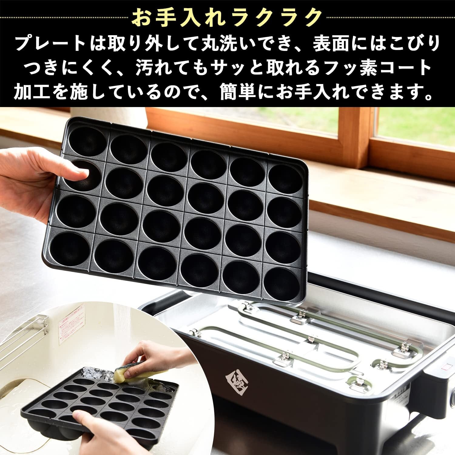 ●たこ焼きプレートは取り外して丸洗いでき、表面にはこびりつきにくいフッ素コート加工が施されているので、お手入れも簡単。