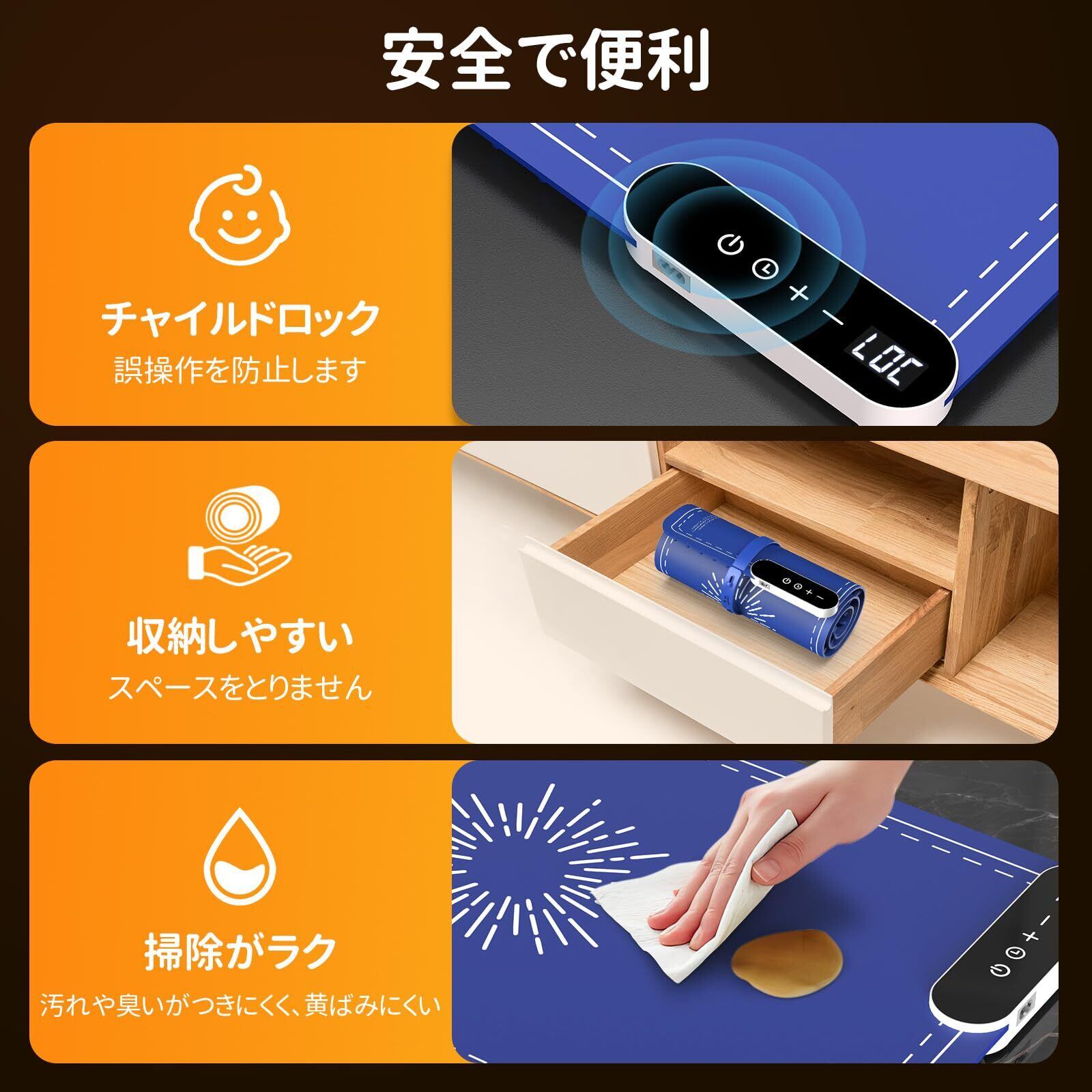 【多機能なスマート操作&チャイルドロック】この食品保温プレートはタイマー付き智能オン/オフ機能を搭載しています。あらかじめ作動時間を設定すれば、起きてすぐにアツアツの朝食を楽しむことができます。最大30種類のタイマー設定からお好みの時間と温度を自由に選べます。さらにチャイルドロック機能でお子様の誤操作を防ぎ、安全性を確保しています。