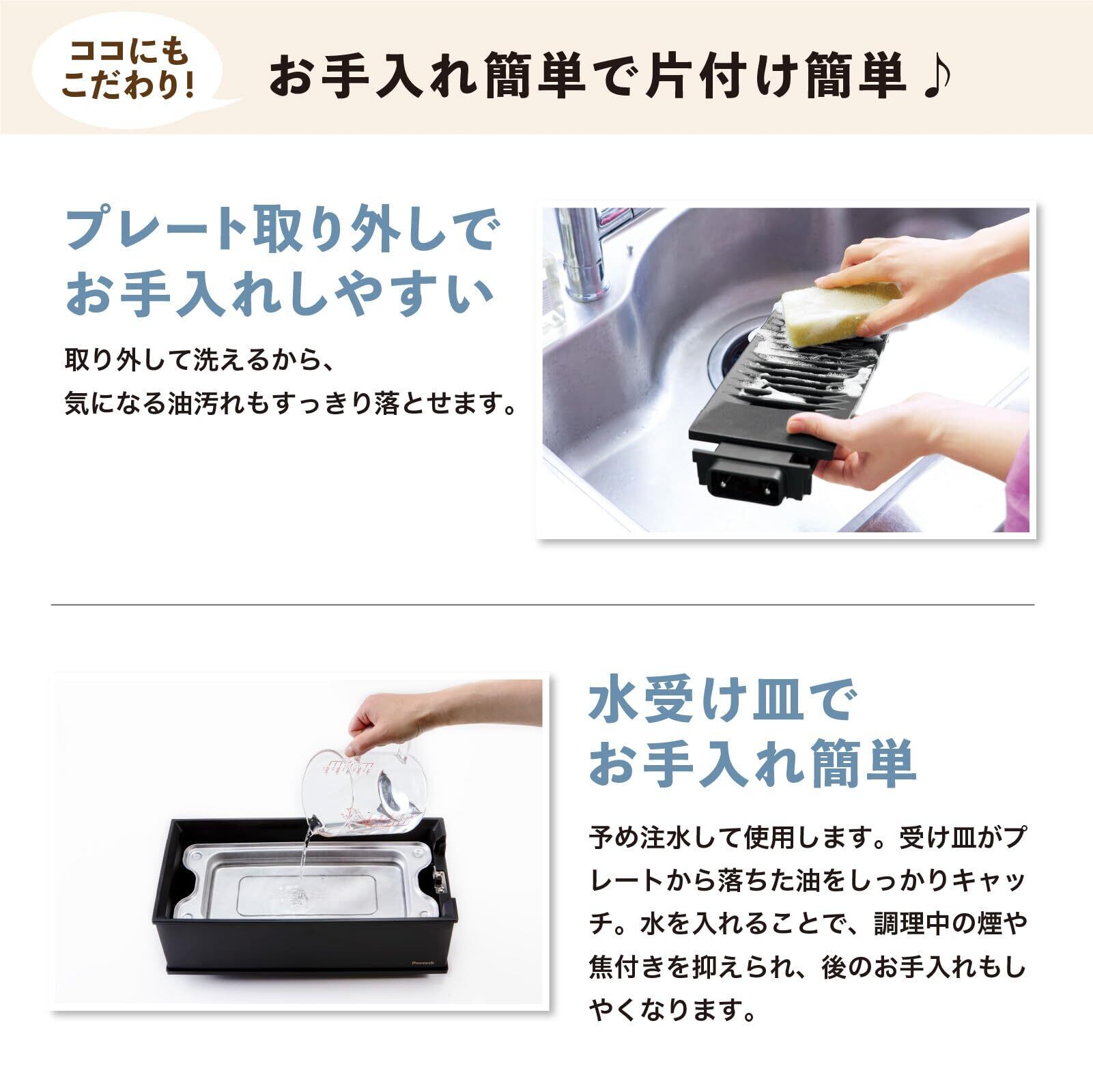 海鮮、焼き鳥や焼肉もこれ1台でいろいろ楽しめます。コンパクト設計で省スペースでも楽しめる。 穴あきプレートで、余分な油を落としながらヘルシーにいただけます。独自の3次元アーチ構造で調理中の煙を大幅カット。1人から2人飲みをオシャレに楽しめます。温度調節機能で、お料理に合わせて温度をコントロールできます。本体にプレートが置かれていない状態では、安全ロック機能が働きます。プレートはフッ素加工で焦げつきにくくお手入れがしやすくなっています。【本体サイズ(約) 】: 幅36×奥行12×高さ13.5cm【本体重量】: 約2.05k【材質】: プレート/アルミ(フッ素コーティング)、胴部/溶融亜鉛メッキ鋼鈑【消費電力】: 500W【定格電圧】: AC100V(50/60Hz)【電源コードの長さ】: 1.4m【発熱体】: シーズヒーター