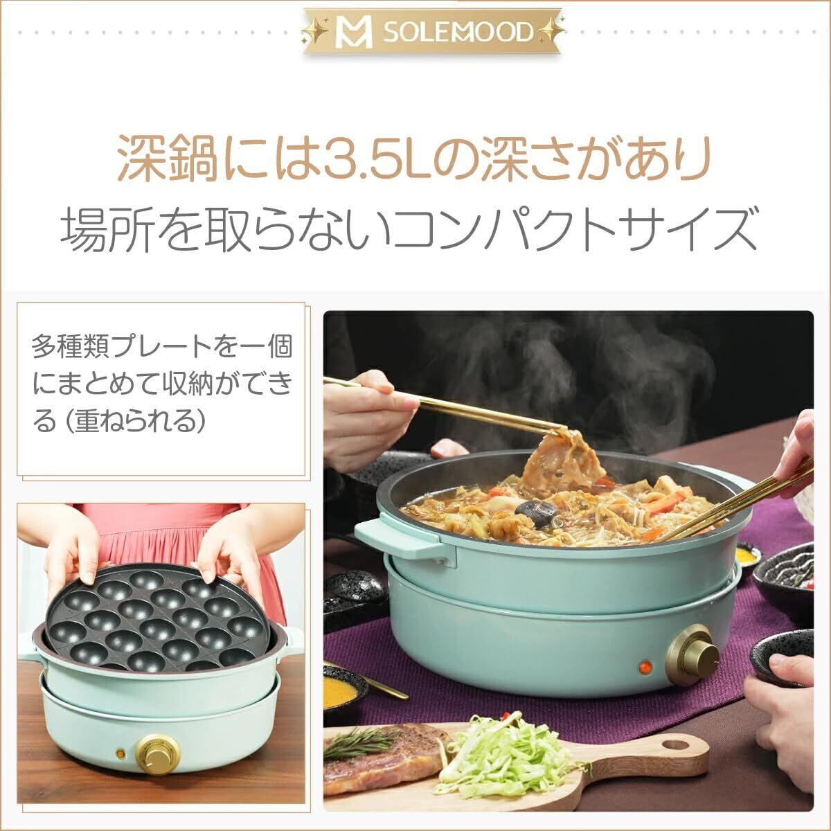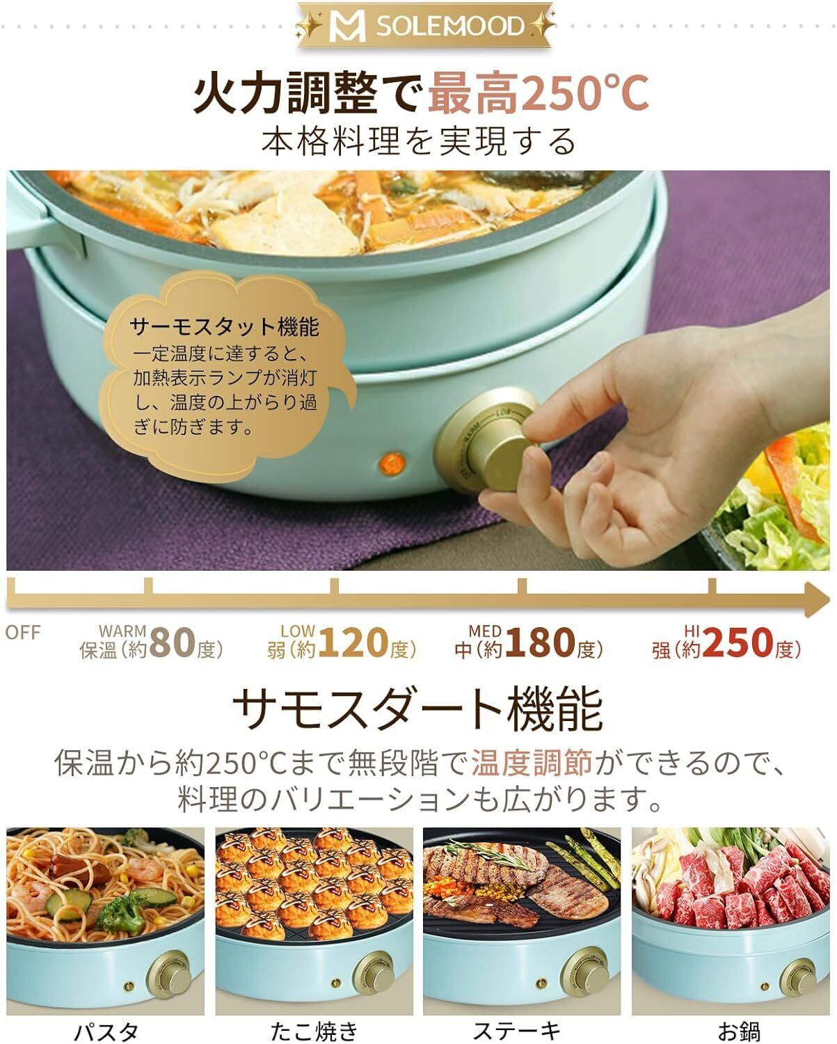 【一台多役】付属した三つのプレートで、たこ焼き、焼肉、しゃぶしゃぶ、お好み焼き、野菜炒めなどの様々な料理がチャレンジでき、一人や皆で一緒に料理を楽しむことができ、たこ焼きプレートを一度に21個分を作ることができます。また、透明なガラス蓋が付いているので、調理の様子が確認できて嬉しいです。●ご注意:プレートと本体の外部素材が一致しない故、ホワイトの深鍋プレートは、ホワイトの本体色よりも少し薄く見える色です。使用には影響与えませんので、予めにご了承ください。