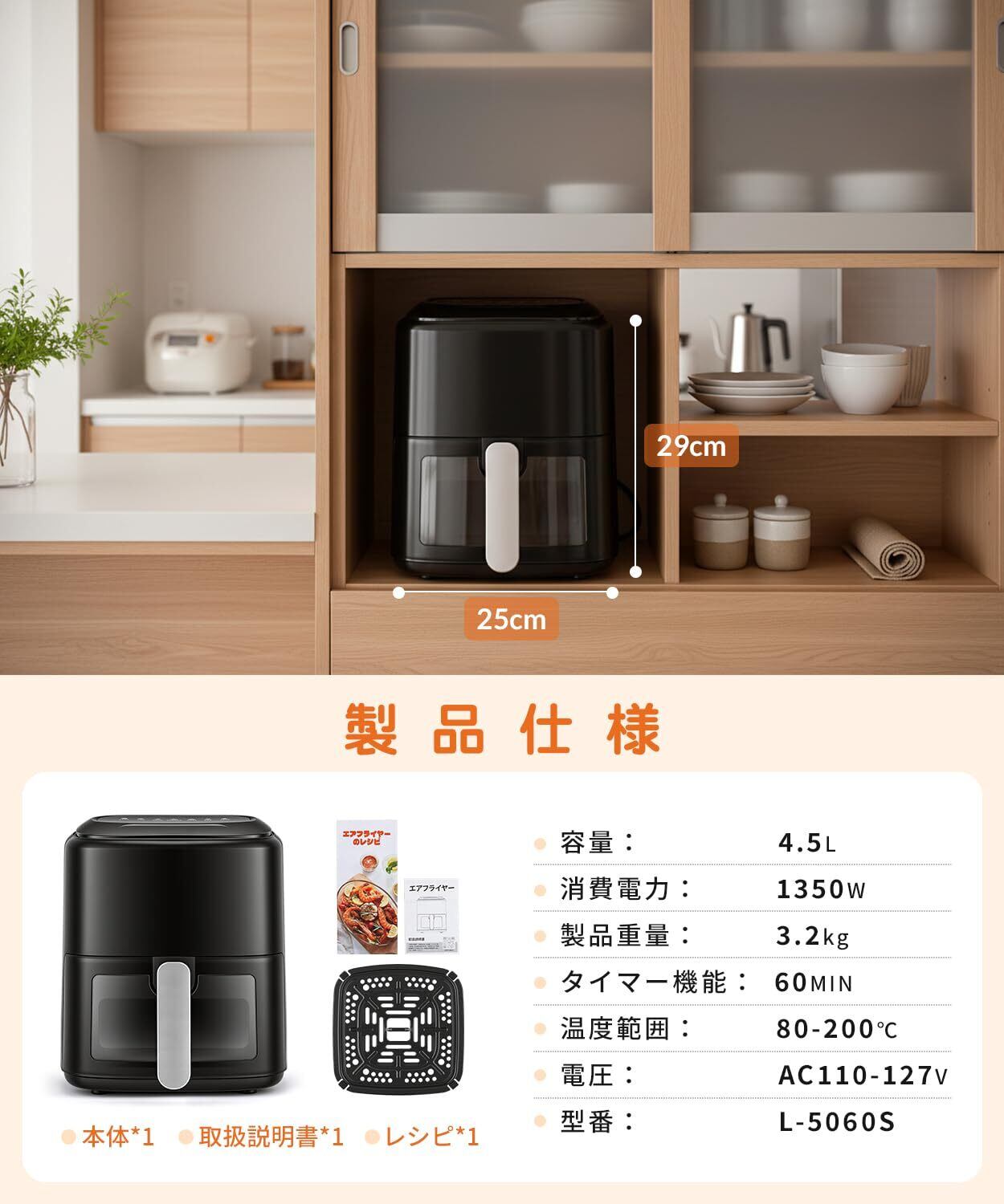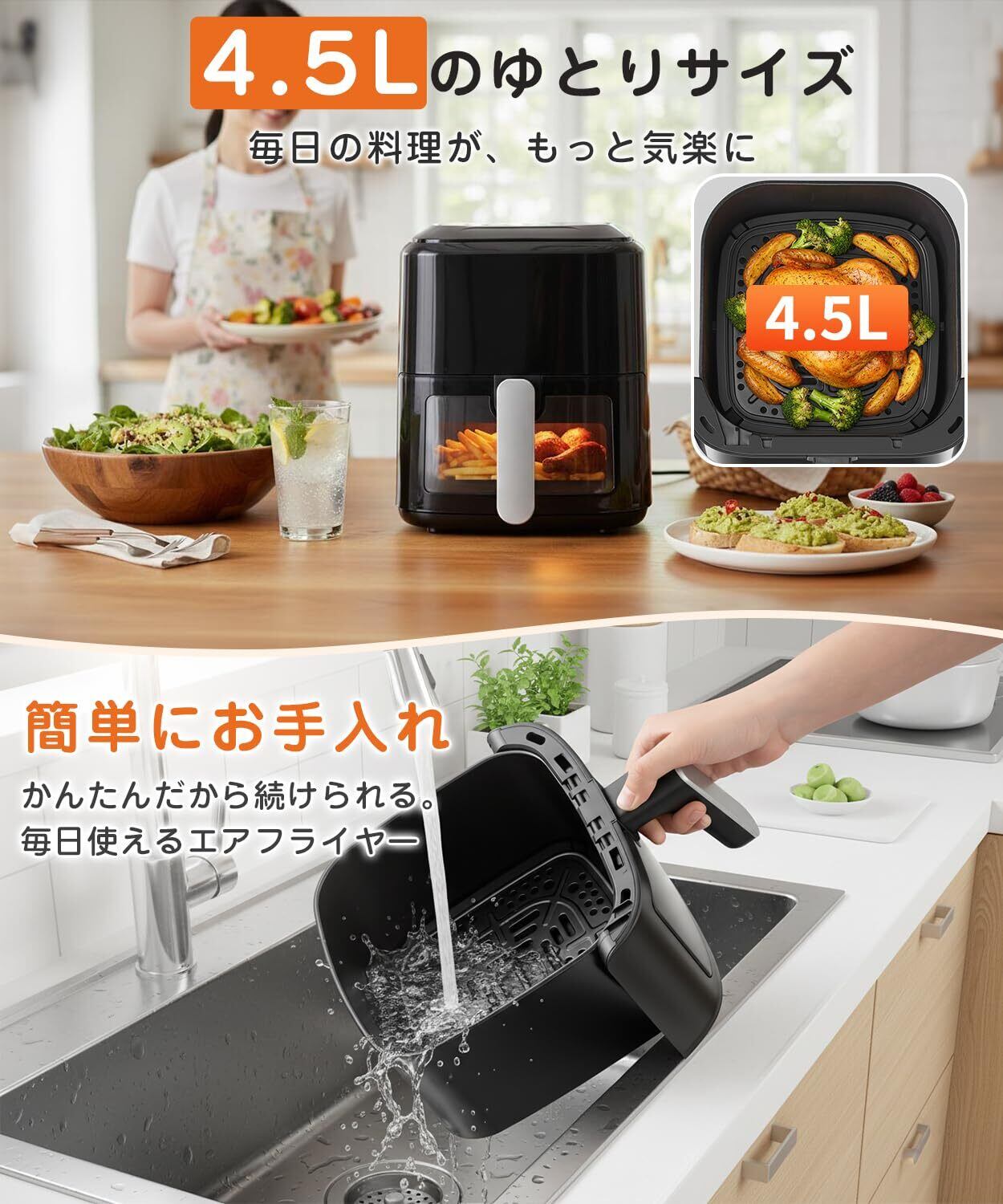 ノンフライヤー 4.5L エアフライヤー 1~5人用 電気フライヤー ノンオイル 揚げ物 惣菜 LEDタッチパネル スマートデジタル表示 省エネ 最高200℃ 温度調節 グリルプレート付属 食品グレードノンスティック加工 過熱保護 初心者向け 家庭用 PSE認証済み