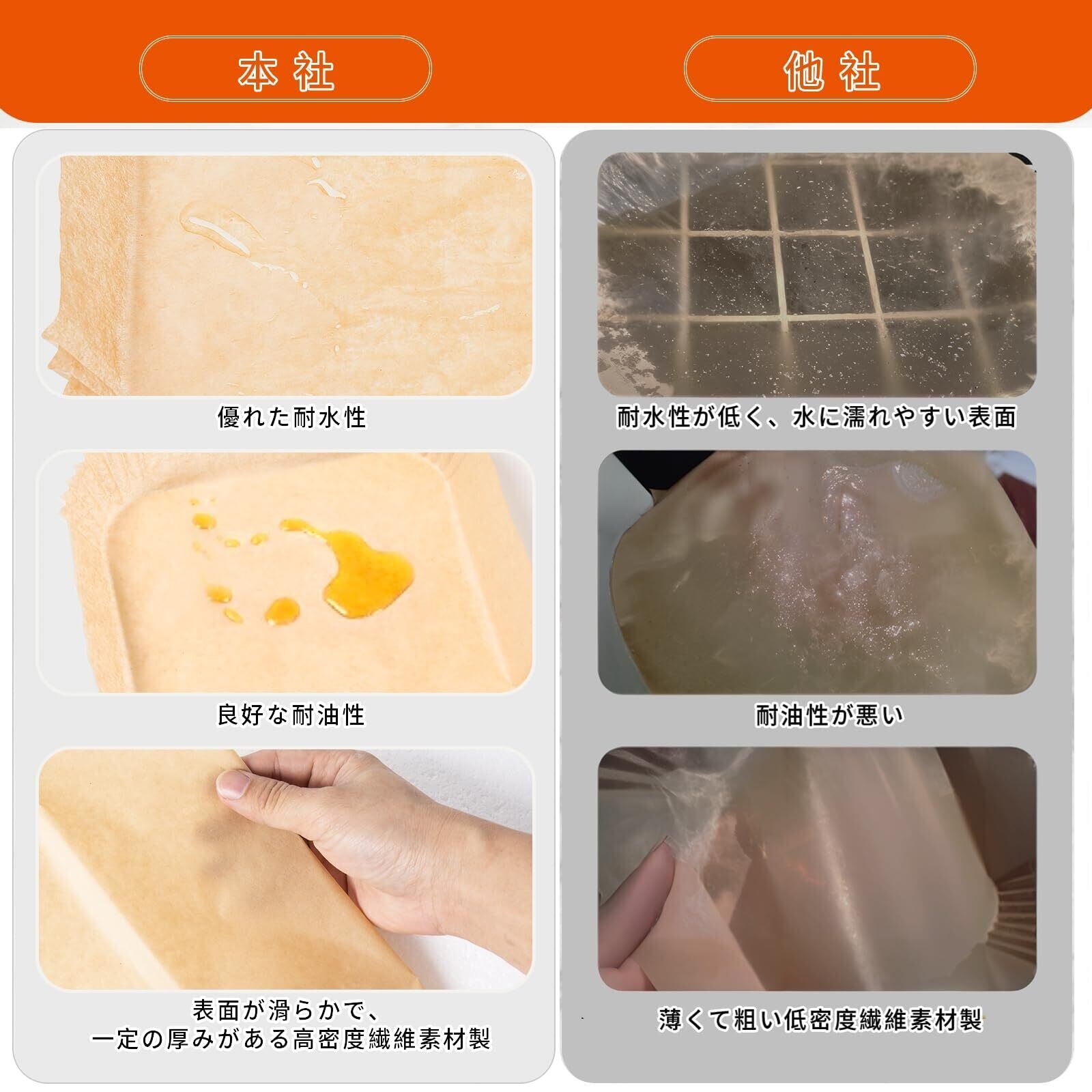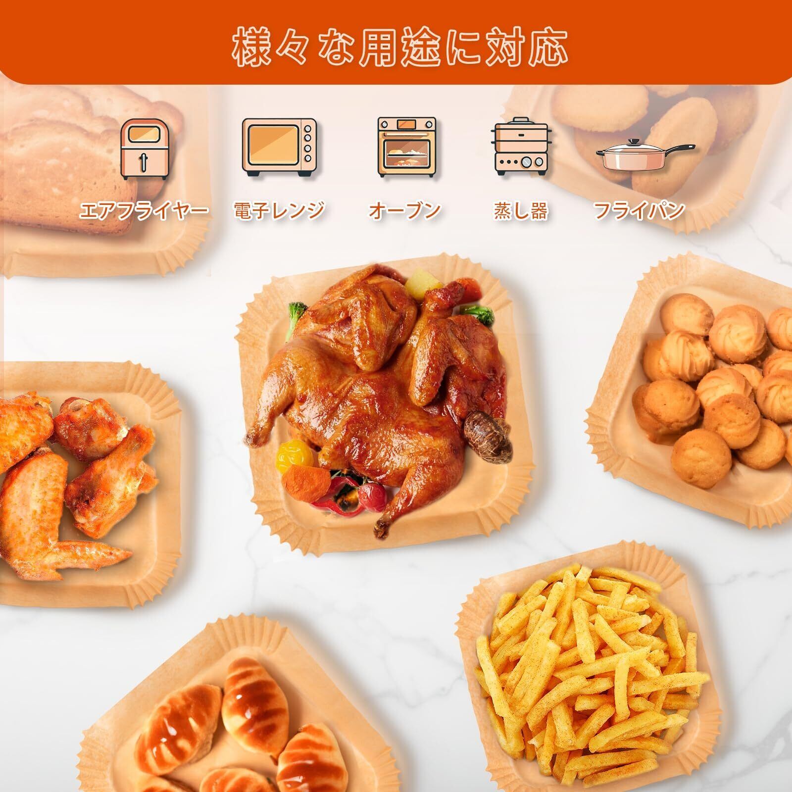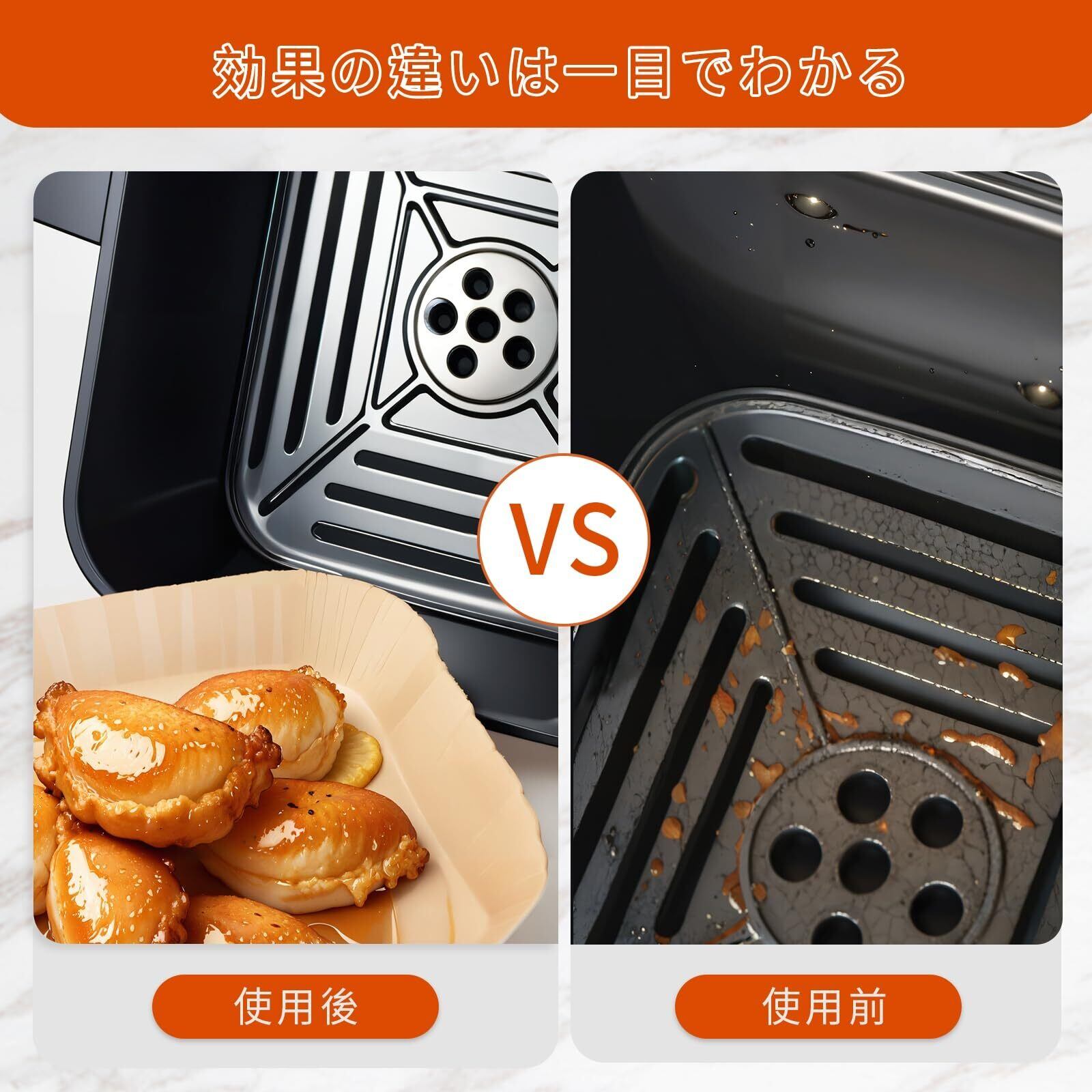 【油汚れ・ベタつき・焦げ付き防止】紙の両面とも耐油性があるため、揚げ物などの調理をすると、調理器具の底にべたや焦げが付きにくいです。また、SAMKYOエアフライヤー用紙は、4.5㎝までの縁が盛り上がっているので、調理する時に周りに油が飛んでいることを防ぎ、全方位で調理器具に焦げが付きないよう、より高い保護効果を発揮します。