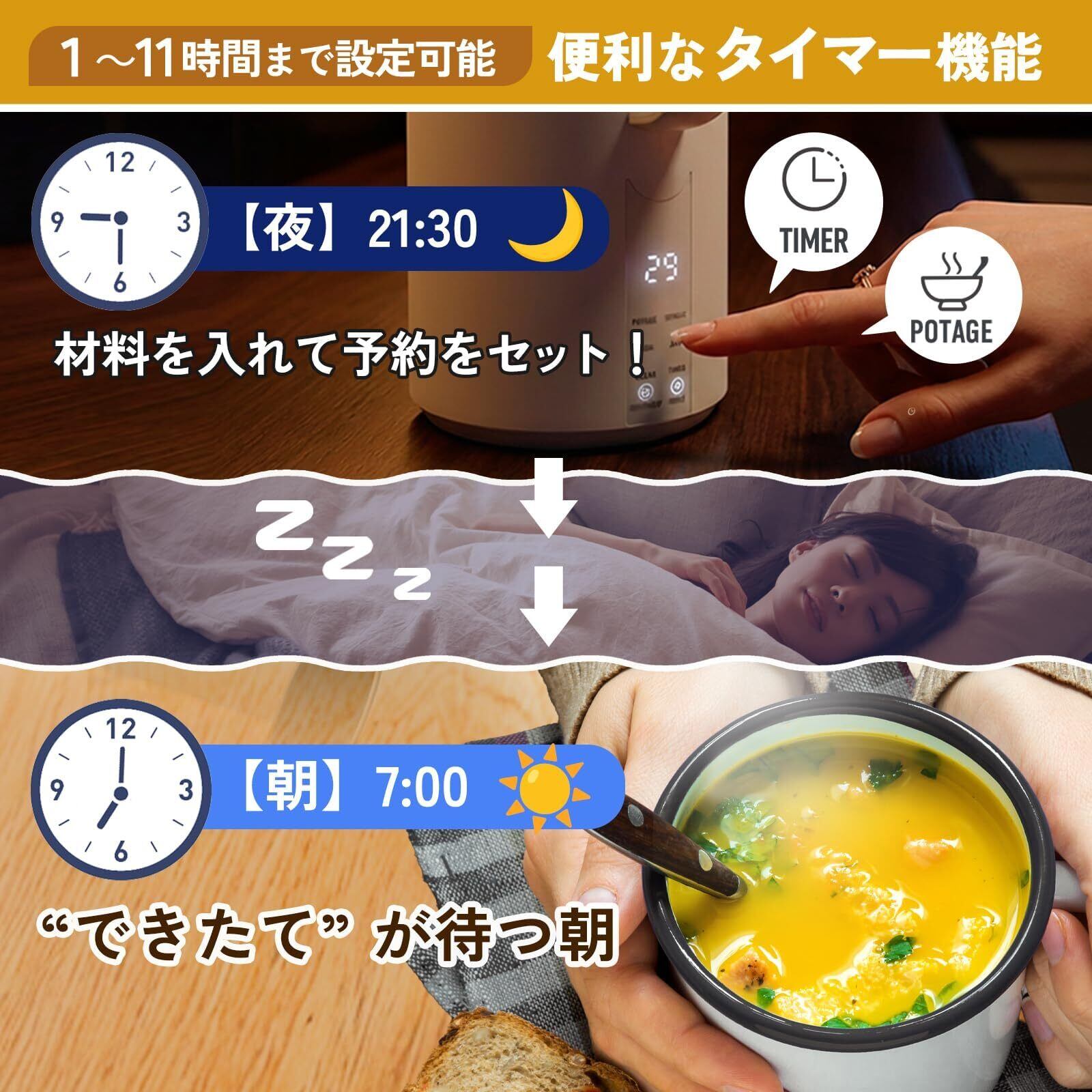 【便利な予約・保温機能】 1〜11時間の予約設定で、起きたてや帰宅時に出来立てを。調理後は最大4時間、約60℃で自動保温されます。