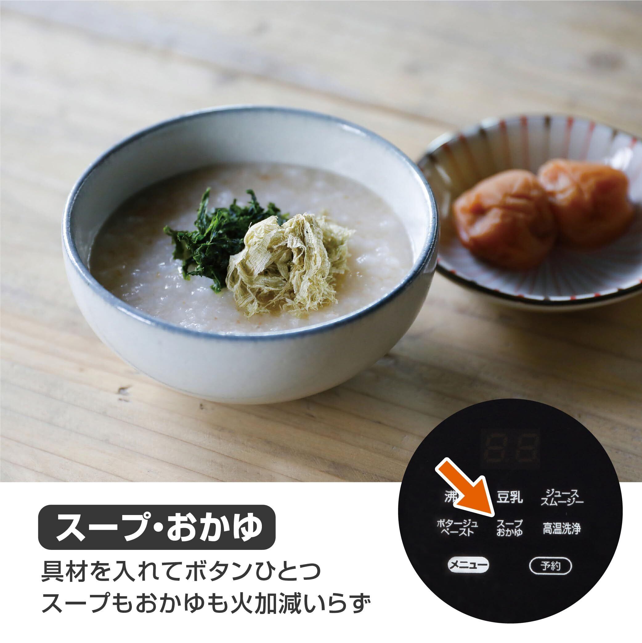 シンプルなタッチパネル式で操作がとても簡単。スープや豆乳、お粥モードなどの調理モードに加えて、最大18時間まで予約できるタイマー機能も搭載しています。時間のない日常に、ちょっとした余裕を生み出してくれる機能が詰まっています
