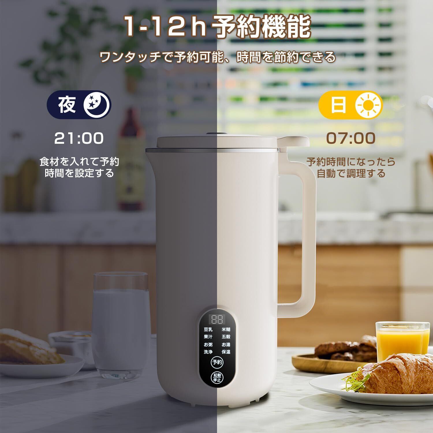 【便利な12時間予約機能付き】 豆乳ミキサーは最大12時間の予約機能と保温機能を搭載しています。朝起きた時や帰宅した時に、新鮮な豆乳や温かいスープを楽しむことができます。大容量で1~3人分に対応でき、様々なメニューに適用し、ご生活をより便利に。