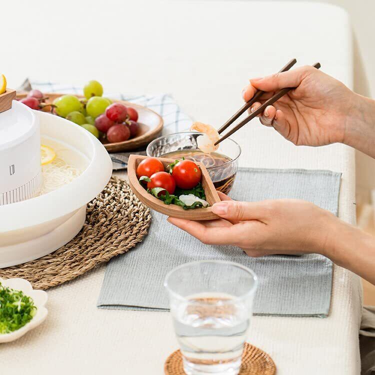 【リアルウッドの薬味トレイで温かみ&映え効果も! ネギやショウガなど薬味を置くトレイには、温かみがあり見栄えもいいリアルウッドを使用。セパレートタイプで取り分けも簡単。