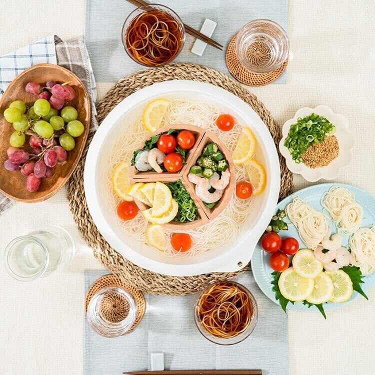 【コンパクトに収納できる!シリコン製の折りたたみボウル お水とそうめんを入れるボウルはシリコン製で、折りたためばペタンと平らに。ちょっとした隙間にも収納できます。ひっかけられる穴もあるので、フックなどに吊り下げた収納も可能。使用後やシーズンオフも置き場所に困りません。