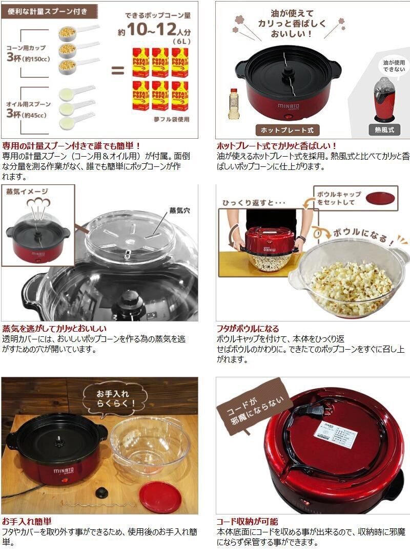 ミナトワークス ポップコーンメーカー POP-601 (レッド) 容量6L 家庭用100V