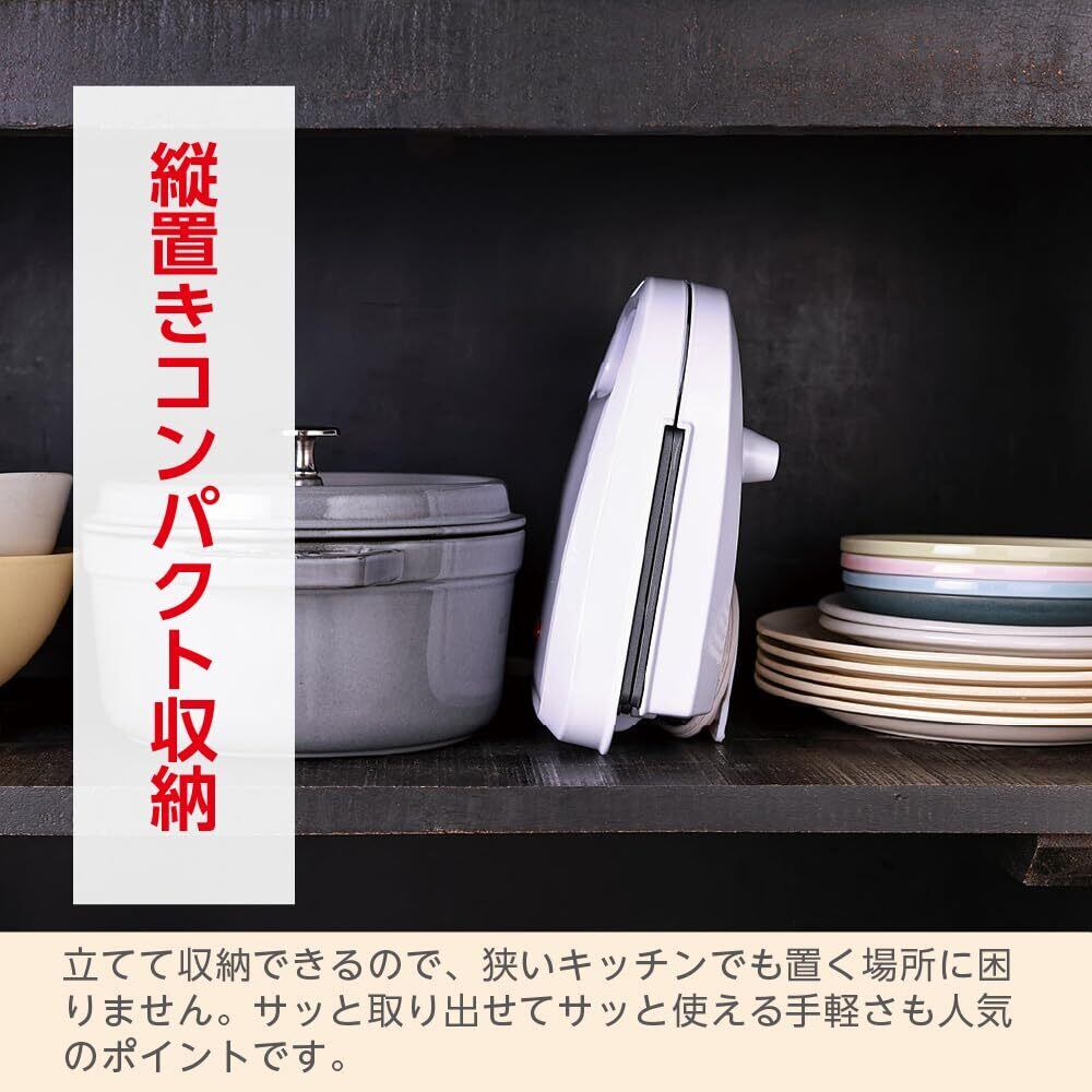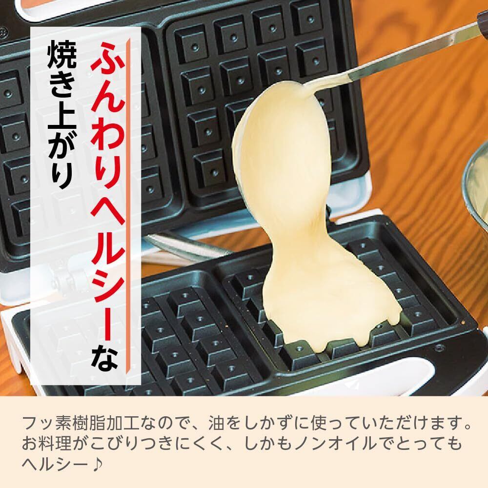 フッ素樹脂加工なので、油をひかずに焼けます。お料理がこびりつきにくく、ノンオイルでヘルシー。ふんわりした食感はさっぱりとして飽きがきません。※ワッフルが焼き上がる目安時間は約3分ですが、焼き足りない場合は時間を延長し、お好みで調節してください。
