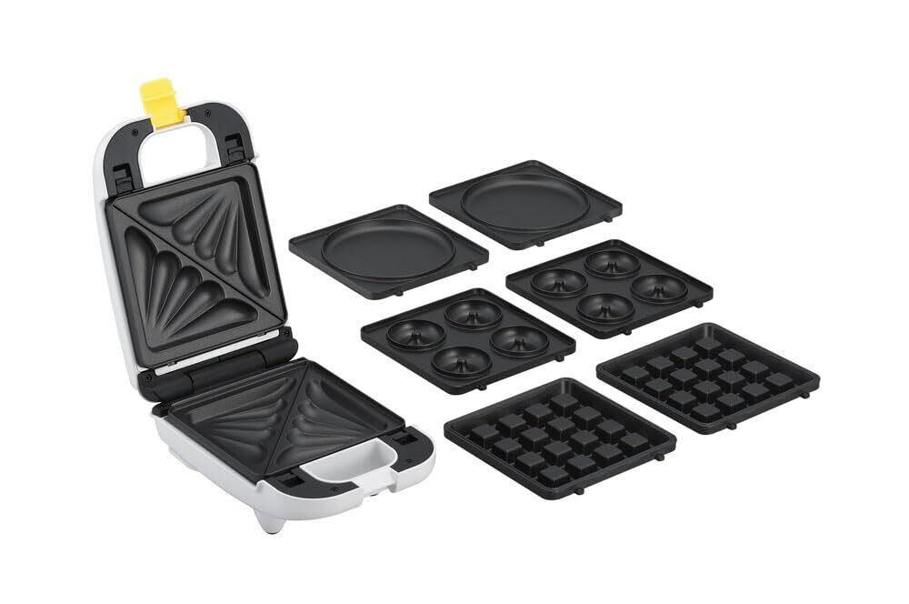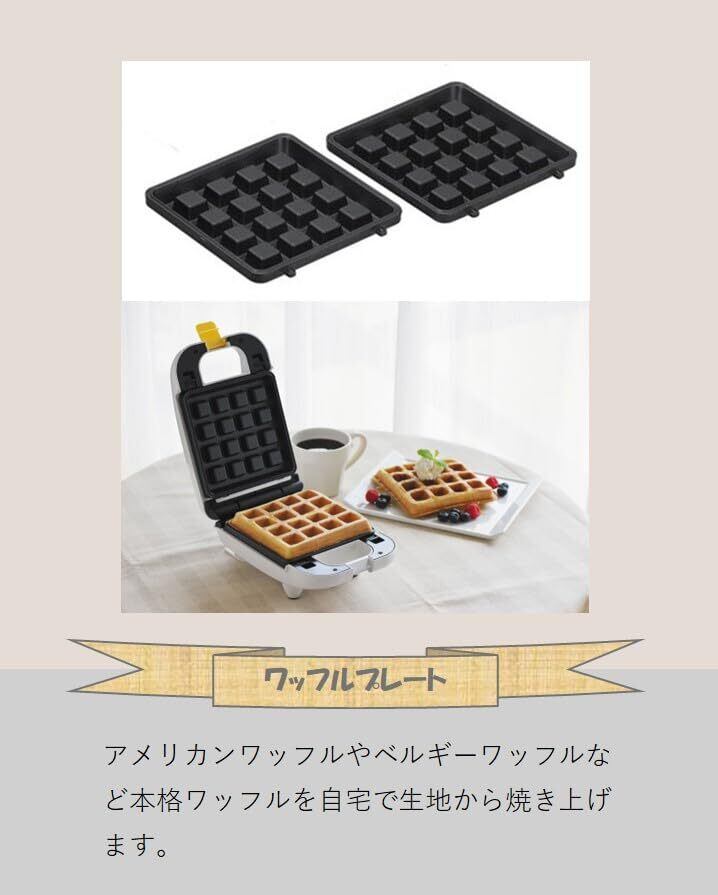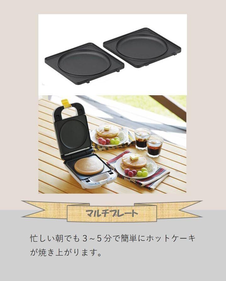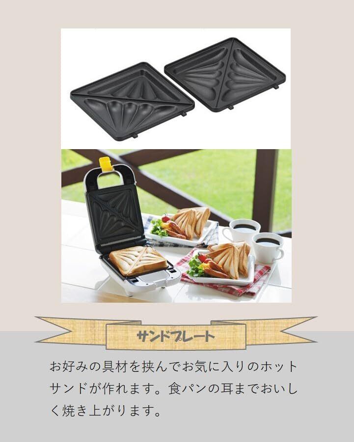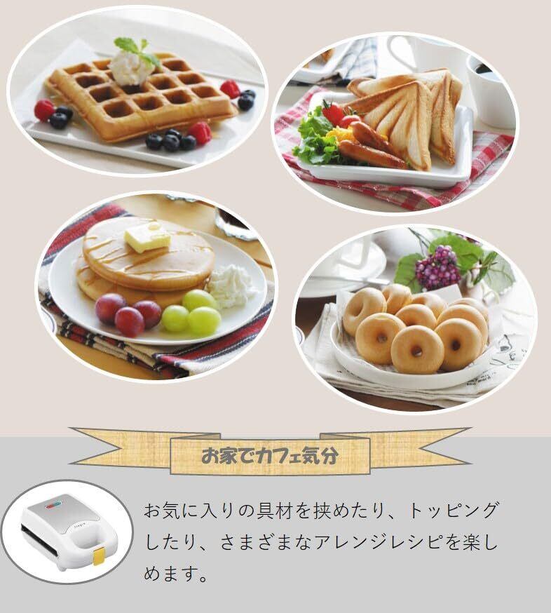 プレートを取り外すことができるホットサンドメーカーです。4種類のプレートが付属しています。ホットサンドはミミがついたまま調理可能です。プレートを付けかえればワッフルやパンケーキ、焼きドーナッツも楽しめます。プレートは取り外して水洗い可能ですので使用後のお手入れが簡単です。