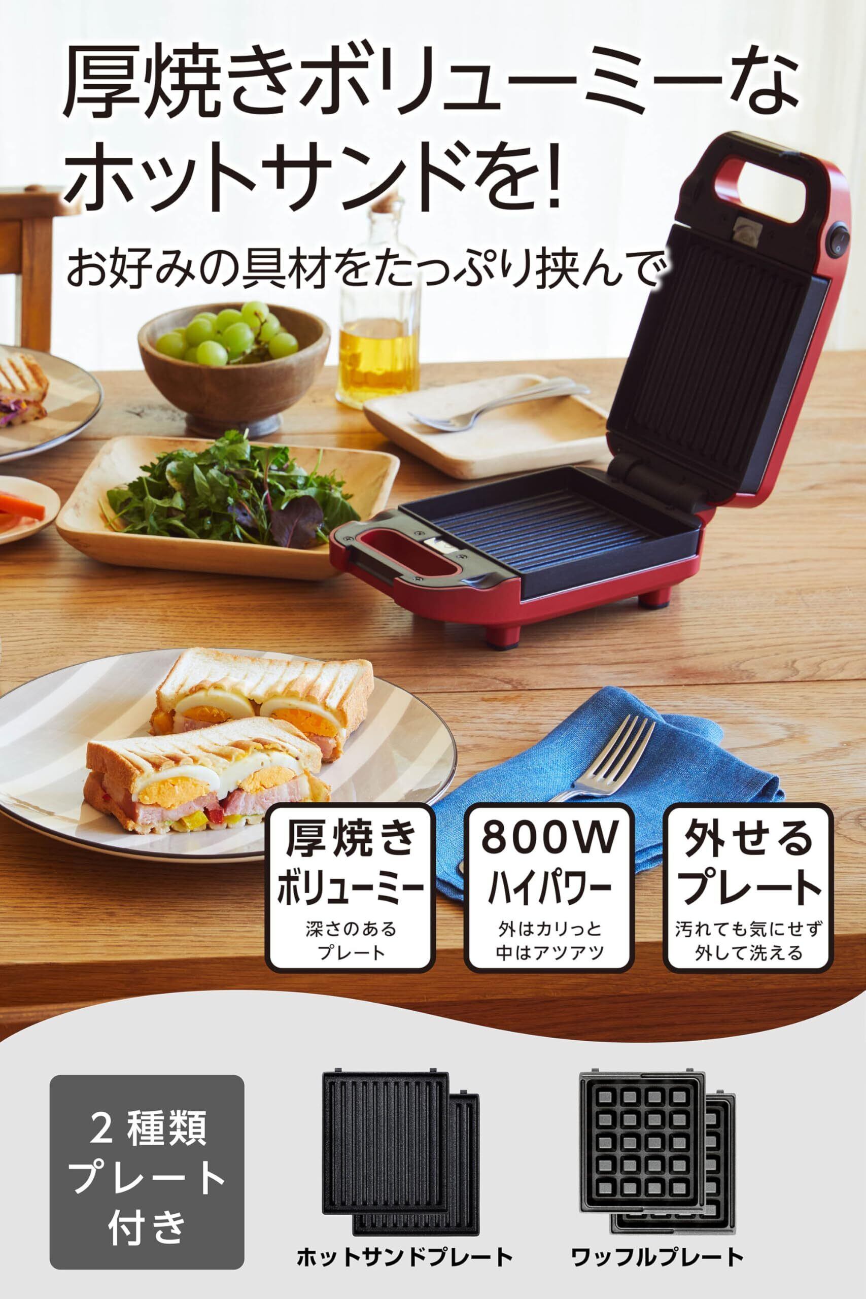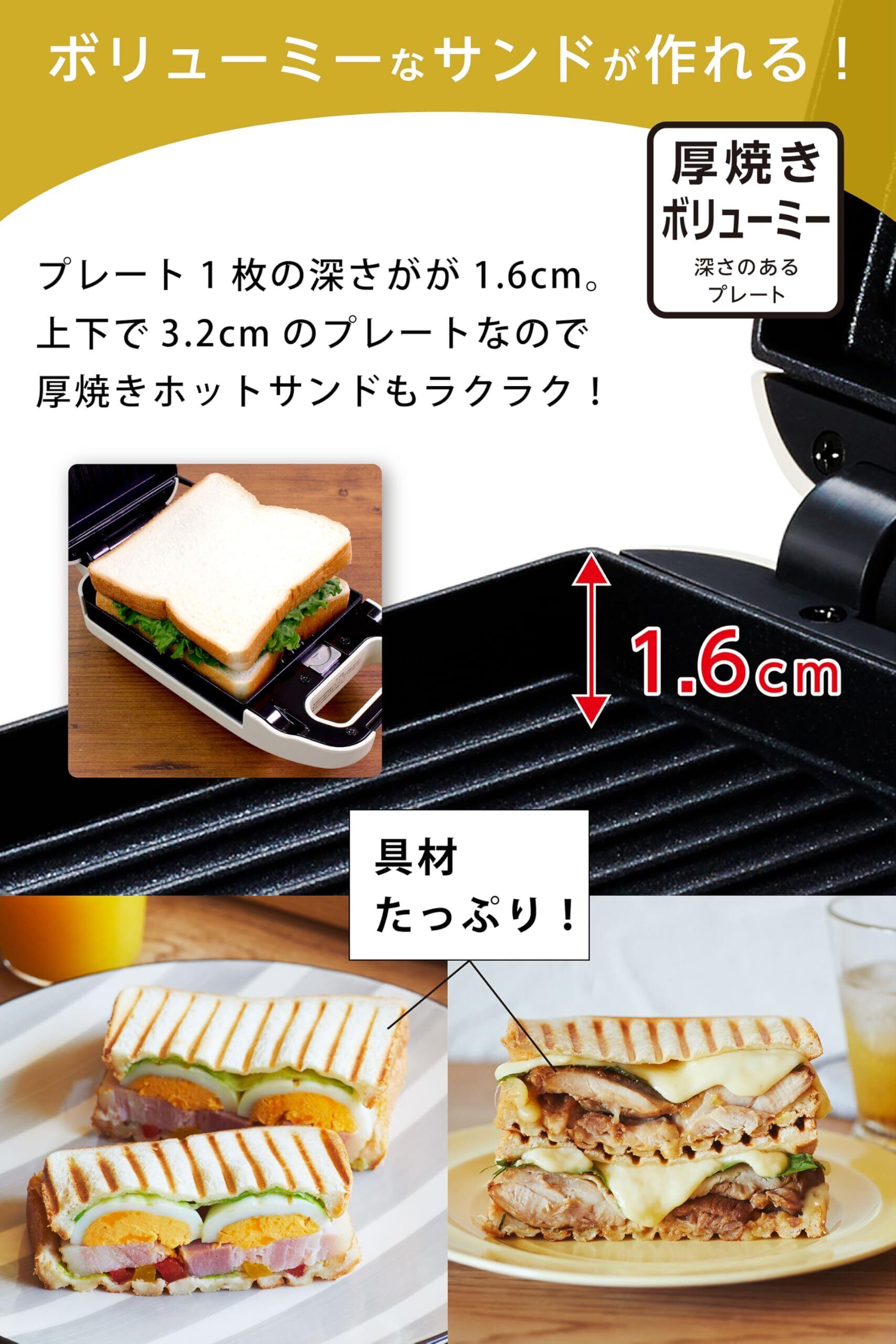 【深型プレートでボリュームたっぷり】プレート1枚の深さが1.6cm。上下で3.2cmのプレートだからボリューミーな厚焼きホットが作れる1枚用のホットサンドメーカーです。お好みの具材をたっぷり挟んでお楽しみください。※この商品に付属しているホットサンドプレートは、きれいな焼き目をつけられる【波型プレート】です。パンの耳をシールするプレス型ではございませんのでご注意ください。