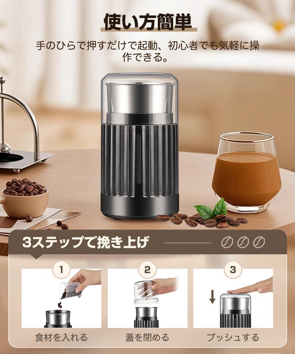 【200Wハイパワー&90G大容量】電動コーヒーミルは200Wの強力モーターを採用し、コーヒー豆や食材などを瞬間に粉砕し、貴重な時間を節約されることができます。また、304ステンレス刃を使用しているため、ムラの発生率が低減し、より細かく、均一に挽くことができます。 そして、電動コーヒーミルは一度に最大90Gのコーヒー豆を挽ける大容量設計で、朝の一杯からおもてなしのカップまで完璧に対応できます。これ一台あれば、忙しい朝でも、自宅で手軽に本格コーヒーが楽しめます。