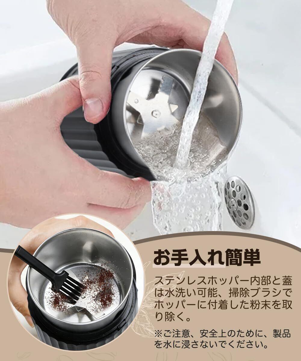 【操作簡単&お手入れ簡単】コーヒーグラインダーはスイッチを押すと起動するシンプルなデザイン、初心者からプロまで気軽に操作できます。ただ3ステップで簡単に研磨頂けます。①食材をカップに入れます。②カップカバーを覆って二重に保護します。③スイッチを押し続けて、自動的に研磨頂けます。押す時間を調整すれば挽き具合が自由に変更可能です。そして、コーヒーグラインダーのお手入れも簡単で、ステンレスホッパー内部と二つの蓋は直接に水洗いできます。また、専用の掃除ブラシが付属しており、手の届きにくい場所も隅々まで綺麗にお手入れできます。(※ご注意、安全上のために、製品を水に浸さないでください。)