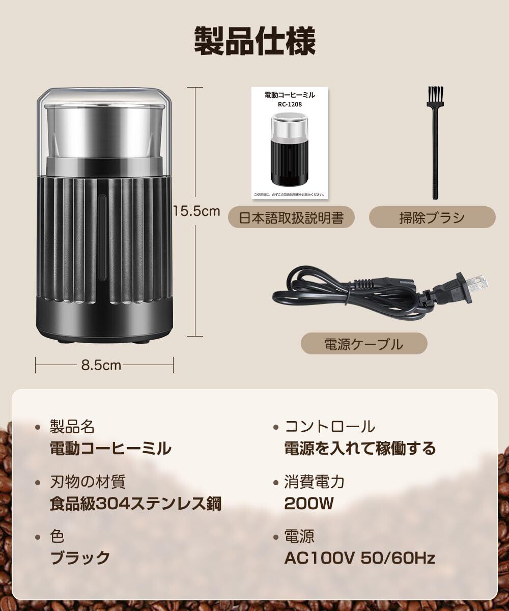 【パッケージの内容&1年間品質】パッケージの内容:電動コーヒーミル、掃除ブラシ、電源ケーブル、日本語取扱説明書。の製品について、全て1年間の品質期間があります。もし使用中に何かの問題がありましたら、是非お気軽にお問い合わせください。