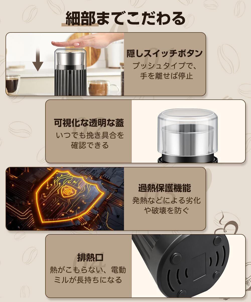 【安全設計&持ち運びやすい】コーヒーミルはご使用する時の安全を確保するために、絶縁体と隠しスイッチが採用されています。304ステンレス製のホッパーは錆や臭いの発生を抑えます。安全性と耐久性を向上させています。また、過熱保護機能も搭載されており、連続運転時間が90秒を超えると自動的に停止し、機器を保護します。そして、コーヒーミルは8.5X8.5X15.5CMのコンパクトサイズで、重量も僅か430G、とても軽量で持ち運びやすいです。家、オフィス、出張、旅行など、様々な場合に大活躍しています。コーヒーミルの静音設計により、家族や周りの人を気にせず、いつでもどこでも挽きたての香りを楽しむことができます。