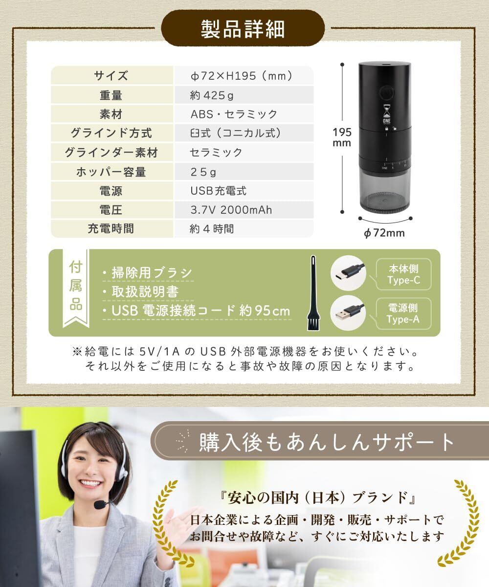 【サイズ】φ72×H195(mm)【素材】ABS・セラミック【重量】約425g【グラインド方式】臼式(コニカル式)【一度に挽ける豆】約25g(2〜3人分)【粗さ調節】39段階【消費電力】30W【電池】リチウムイオン電池 3.7V 2000mAh【定格入力】DC5V 1A【充電時間】約4時間【付属品】掃除用ブラシ・USB電源接続コード(Type-A→Type-C)約95cm・取扱説明書