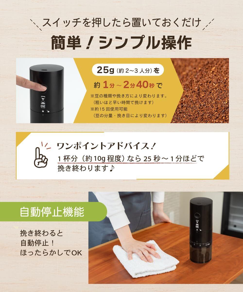 『ワンボタンで自動挽き』ボタンを押すだけ!どなたにも分かりやすい操作でコーヒー豆25g(約2〜3人分)を約1分〜2分40秒で挽けます。※豆の種類や挽き方により変わります。(粗いほど早い時間で挽けます)1杯分(約10g程度)なら25秒〜1分ほどで挽き終わります挽き終わったら自動で停止するから楽々&安心です。