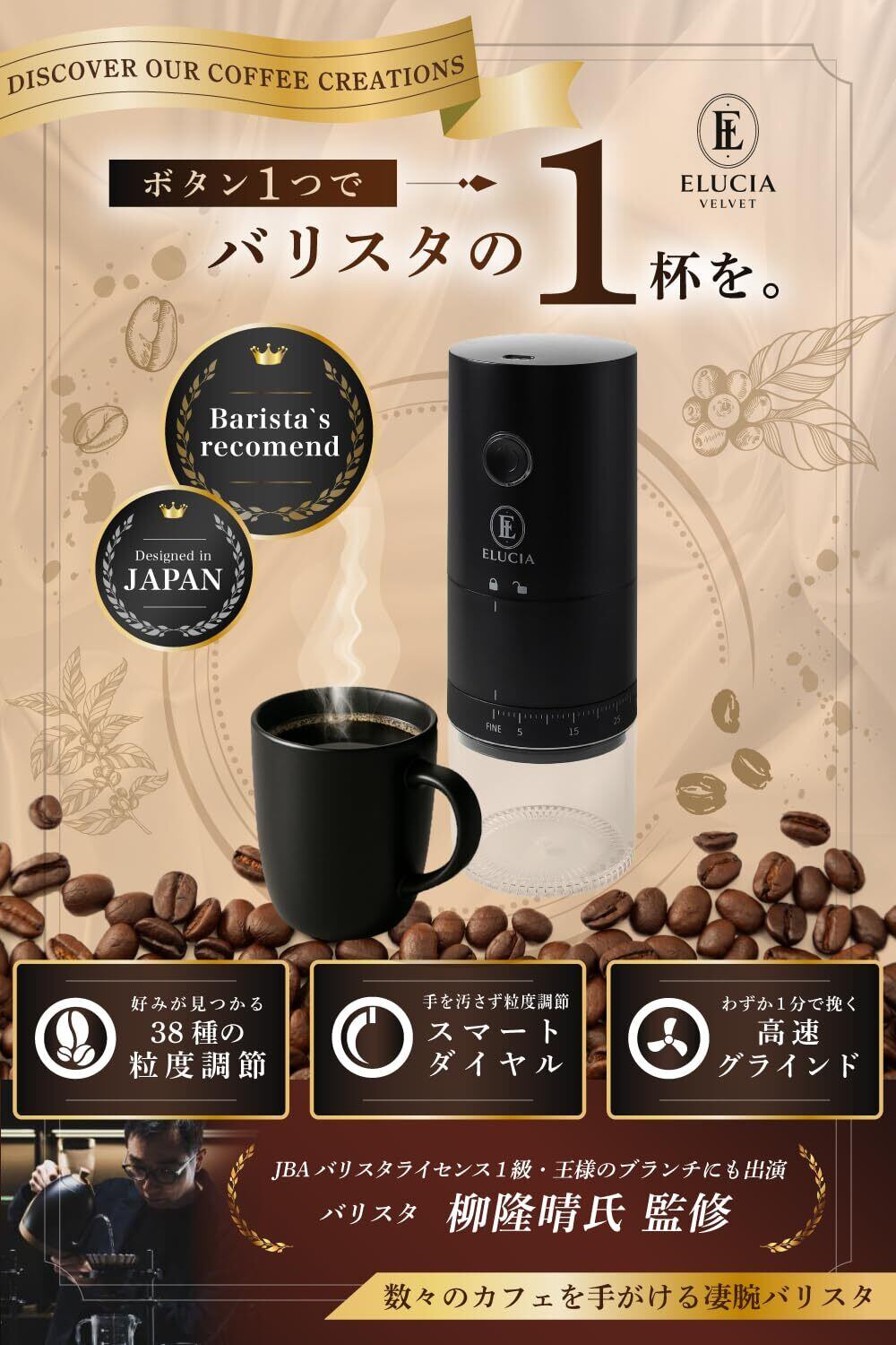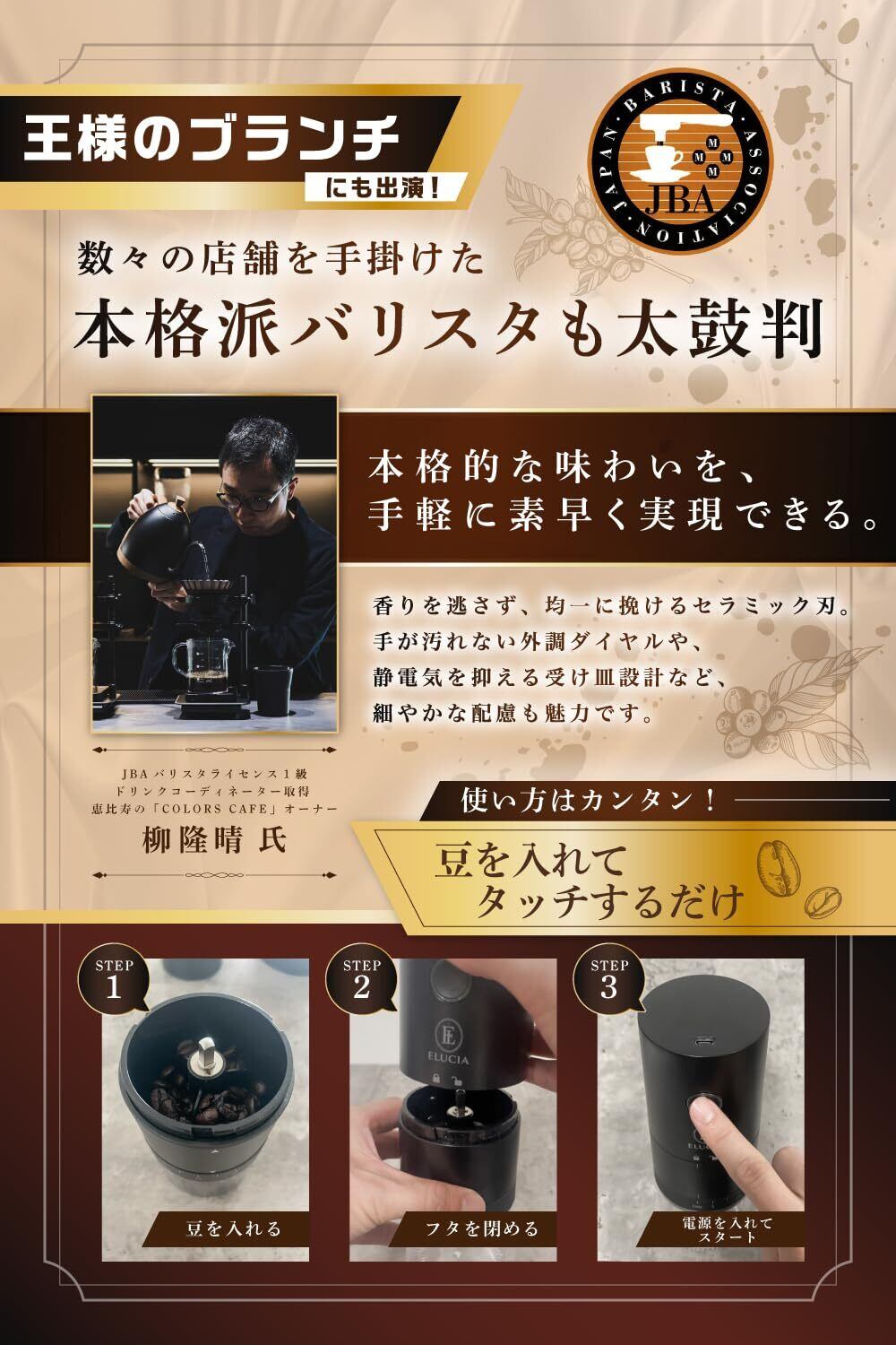 【恵比寿の隠れ家コーヒーショップ バリスタと共同開発】「手動ミルは疲れる」「もっと手軽に淹れたい」そんな声に応え、恵比寿の隠れ家カフェで腕を振るうバリスタと共同開発しました。 プロの目線と日常使いのしやすさを両立した、はじめての電動コーヒーミルにも最適なモデルです。