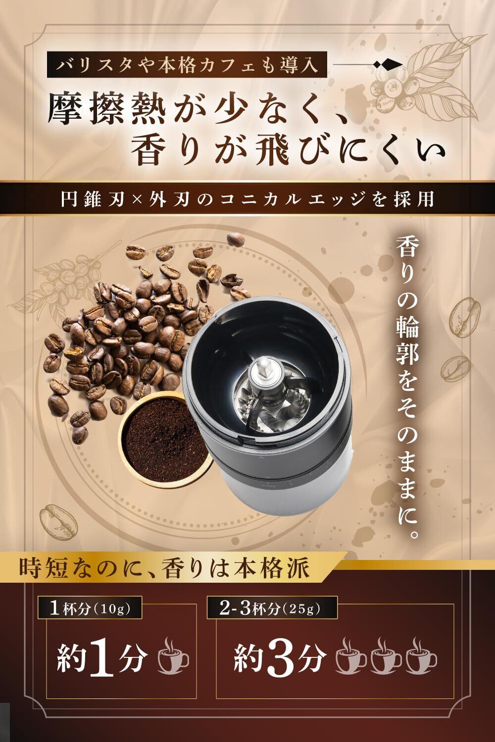 【手動よりも簡単で疲れない ブレのない香りはコニカル式から】豆を入れてフタを閉めスイッチを押すだけ。誰でも簡単に挽きたてのコーヒーを楽しめます。 1杯分の豆なら約1~1分半、2~3杯分でも約2~4分でスムーズに挽けるため、忙しい朝やリラックスタイムにもぴったりです。 さらにプロも愛用するコニカル式(円錐型)の刃構造によりブレの少ない粒度で香りをしっかり再現。 初心者でも手軽に本格的な風味を引き出せるミルに仕上げました。