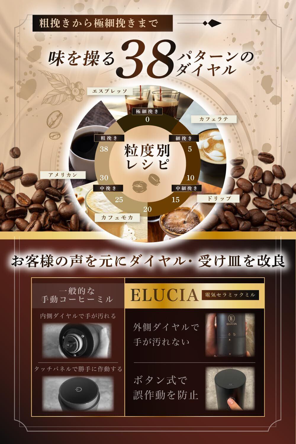 【粒度の調整は38段階 あなただけのお好みの1杯を】豆の挽き加減は味わいを左右する大切なポイント。 本製品は38段階の粒度調整に対応しており、極細挽きから粗挽きまでお好みに合わせて自由に設定できます。 また、従来品によく見られる“内側のダイヤル式”ではなく外側に調整ダイヤルを配置。手を汚さずスムーズに操作できるため初めての方でも迷わず扱えます。 エスプレッソ、ハンドドリップ、フレンチプレスなど、抽出方法に合わせて最適な挽き具合を選べます。
