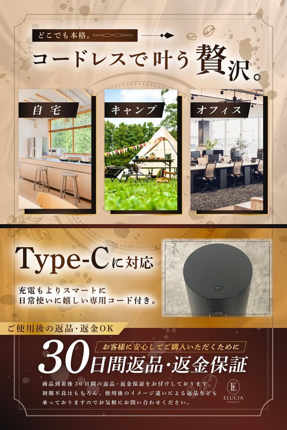 【持ち運びも簡単 アウトドアシーンでも活躍】持ち運びに便利なコンパクト設計で自宅だけでなくキャンプやピクニックなどのアウトドアシーンでも活躍します。 コードレス&USB充電式のため電源が取れない場所でも手軽に挽きたてのコーヒーを楽しめます。 また従来品によく見られる天面のタッチ式ボタンではバッグの中で誤作動が起きることもありましたが本製品は側面に物理ボタンを配置。 移動時や収納時の誤作動を防ぎ安心して持ち運べる設計になっています。 す商品は日本国内で最終検品を実施しており品質管理にも万全を期しています。 さらに万が一の不良にも対応できる間のメーカー付き。 使いやすさと信頼性の両方を兼ね備えた日常にもアウトドアにも頼れる1台です。
