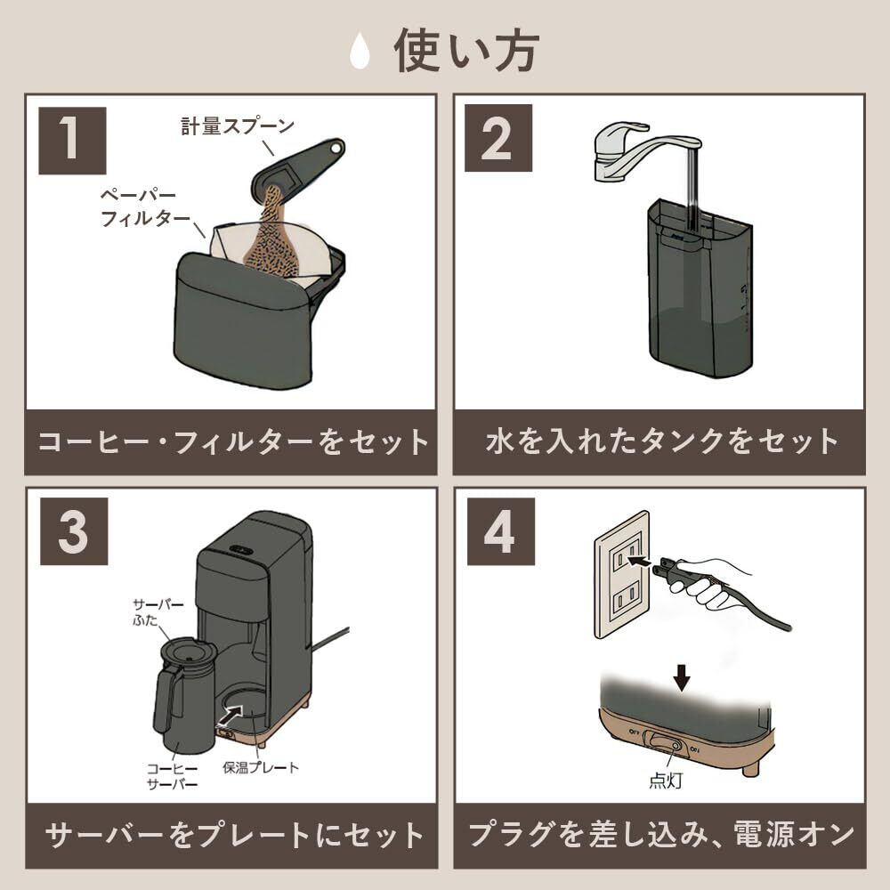 【使い方】①コーヒー・フィルターをセット。②タンクに水を入れ、セット。③サーバーやマグボトルをプレートにセット。④コンセントにプラグを差し込み、電源オン!※マグボトルへドリップするときは必ず飲み口やせんを外してください。 ※背が低いマグボトルの場合、ドリップ時にコーヒーが飛び散る場合があります。 ※マグボトルにドリップするときは必ず置台を使用してください。 ※口径の小さいマグボトルには使用しないでください。 ※マグカップは使用できません。【お手入れ】水タンクは着脱式なので、給水もお手入れもかんたん!紙フィルターなので、フィルターを捨てるだけ!メッシュフィルターよりお手入れ簡単です。