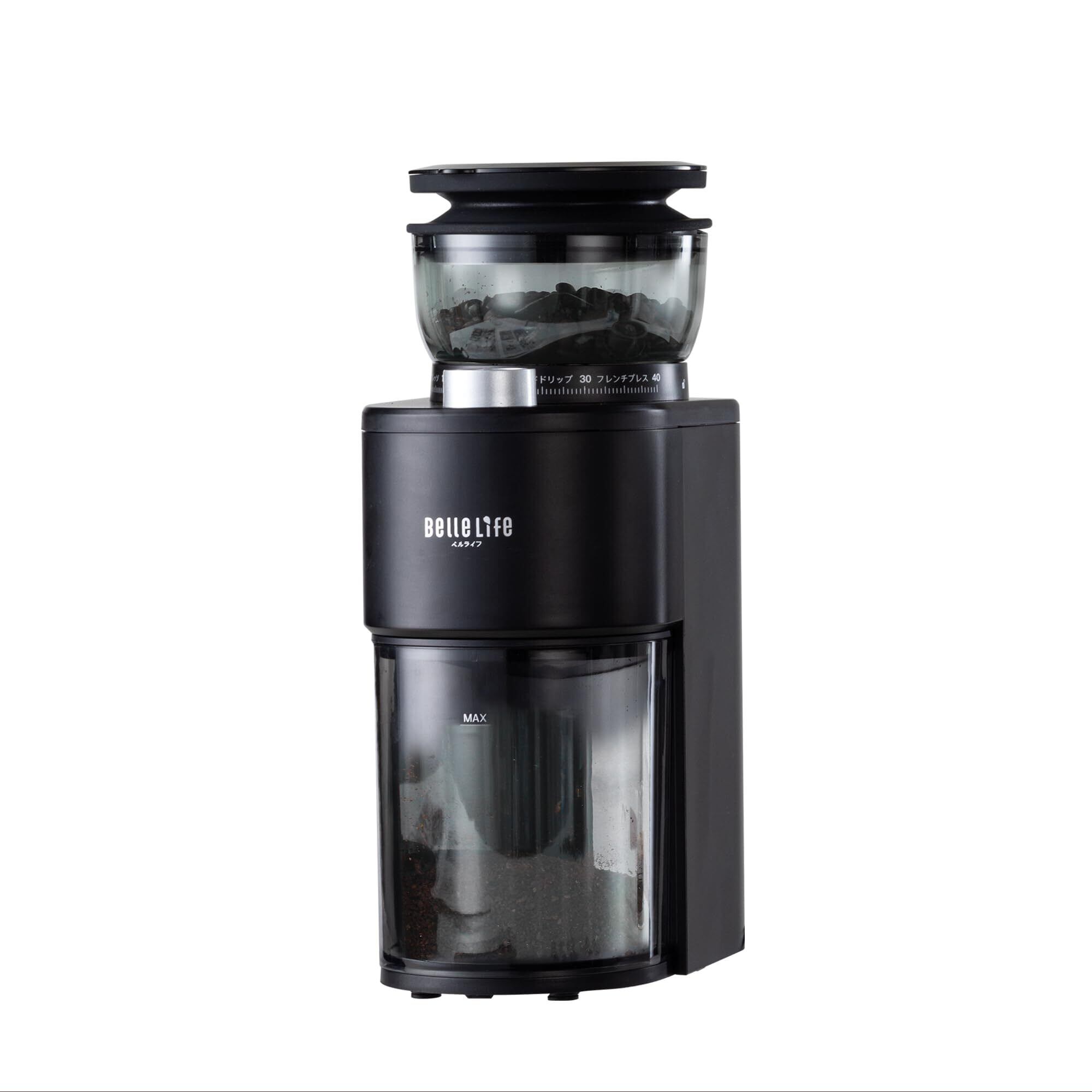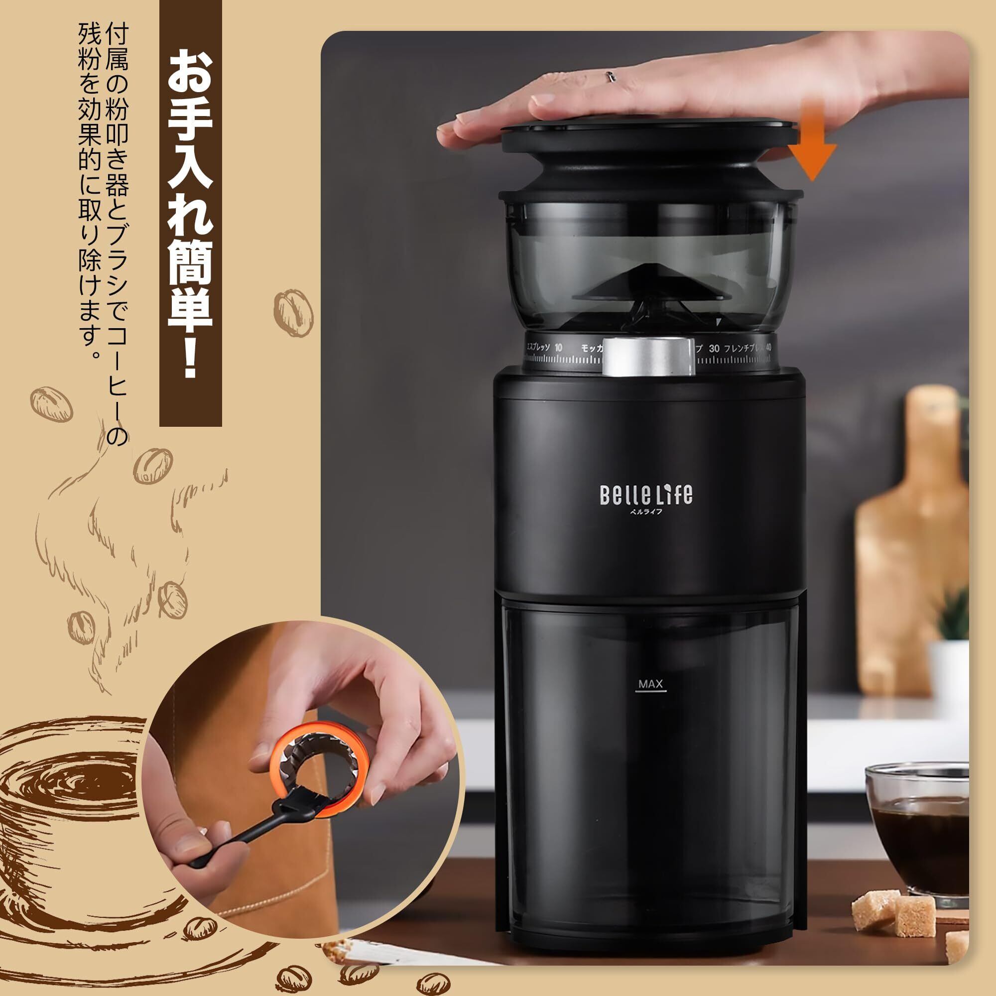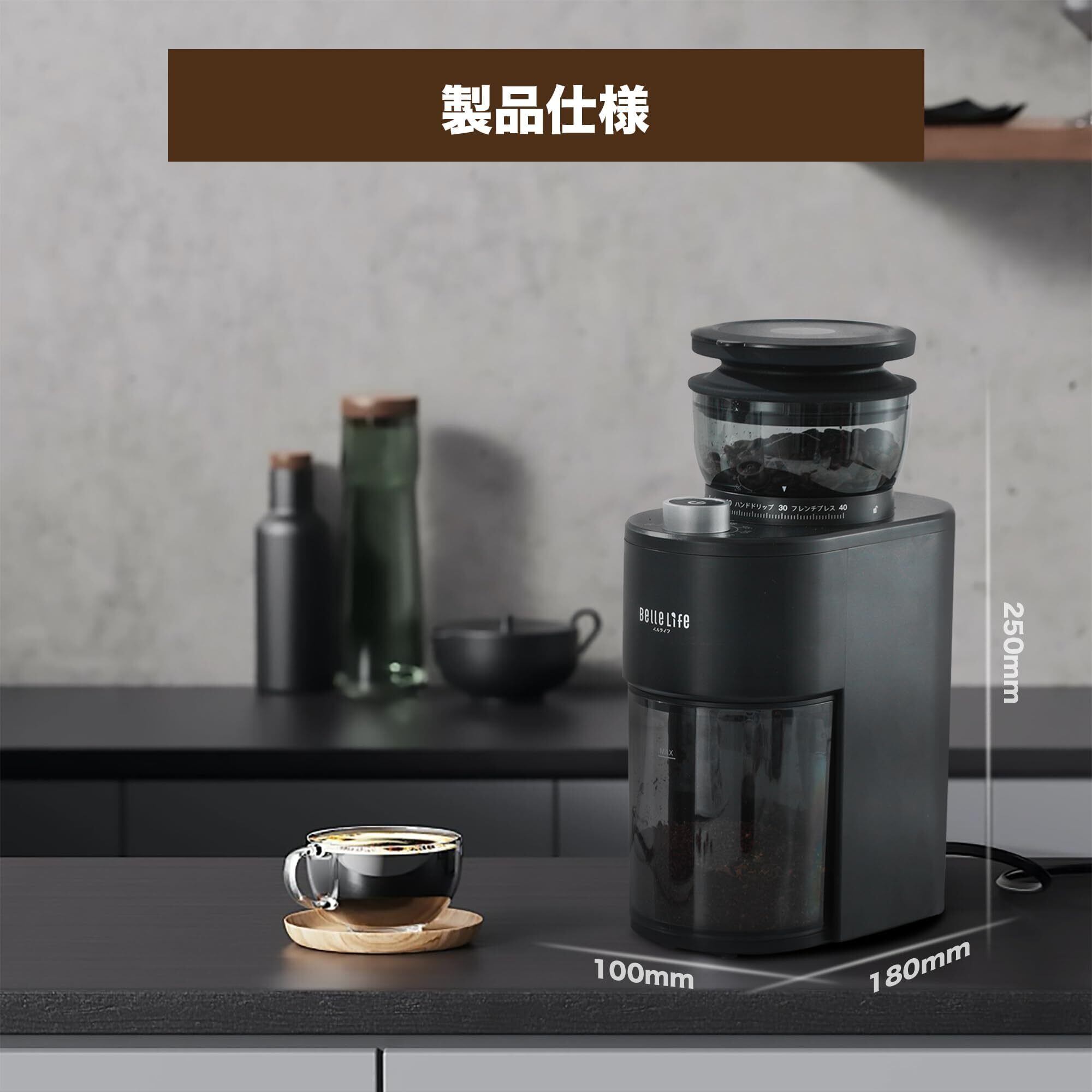 BelleLife コーヒーミル 電動 コーヒーグラインダー コーン式コーヒーグラインダー 極細~粗挽き 粒度40段階設定 コーヒー粉砕機 小型 珈琲ミル 静電気飛散防止豆挽き 粉末 取り外し可能 掃除ブラシ付