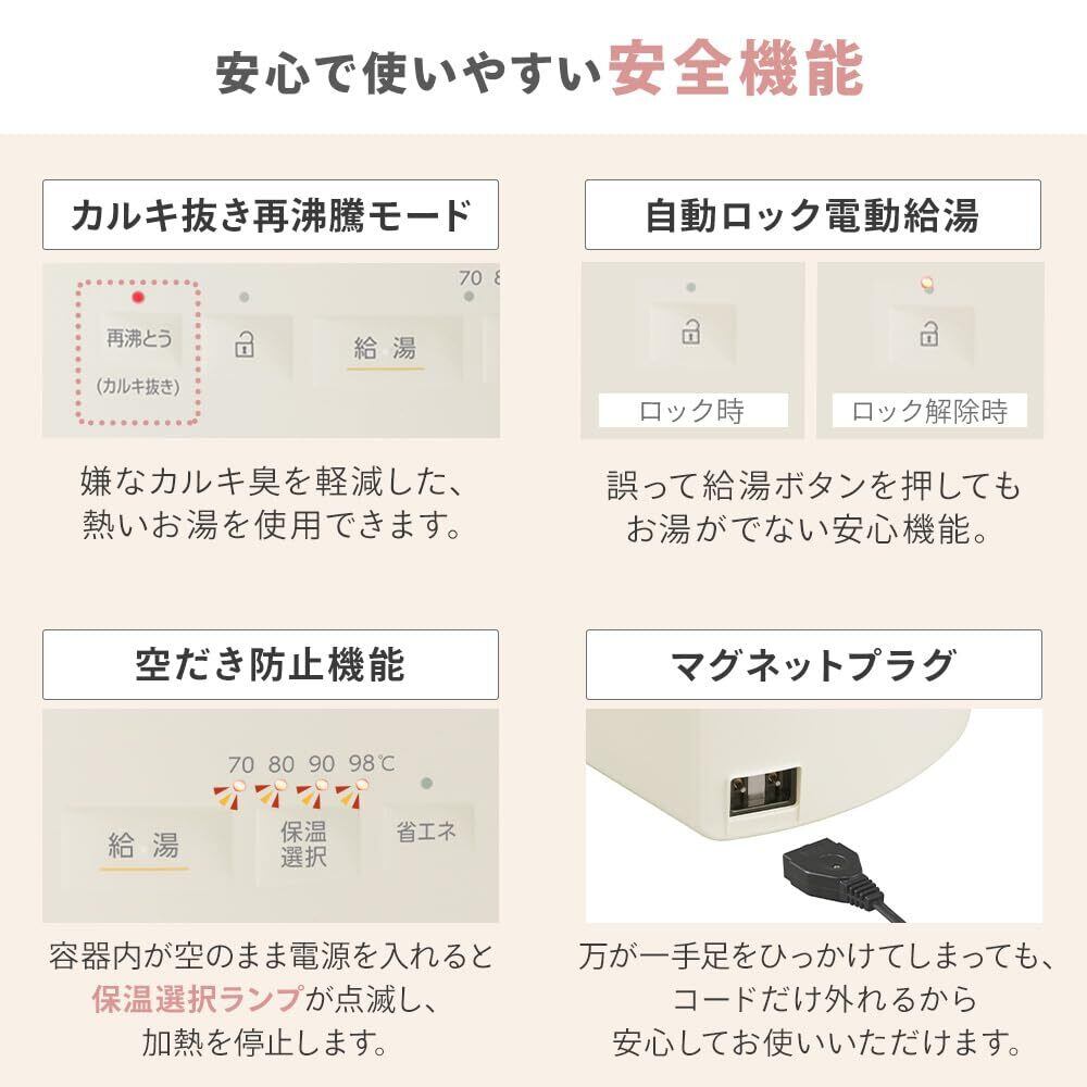 【安心で使いやすい安全機能】自動ロック電動給湯だから誤って給湯ボタンを押してもお湯が出ないので、お子様のいるご家庭でも安心してお使いいただけます。 ◆ 空だき防止機能 容器内が空のまま電源を入れると、ロック解除以外のすべてのランプが点滅して、加熱を停止します。 ◆ マグネットプラグ 万が一手足をひっかけてしまっても、コードだけ外れるから安心してお使いいただけます。