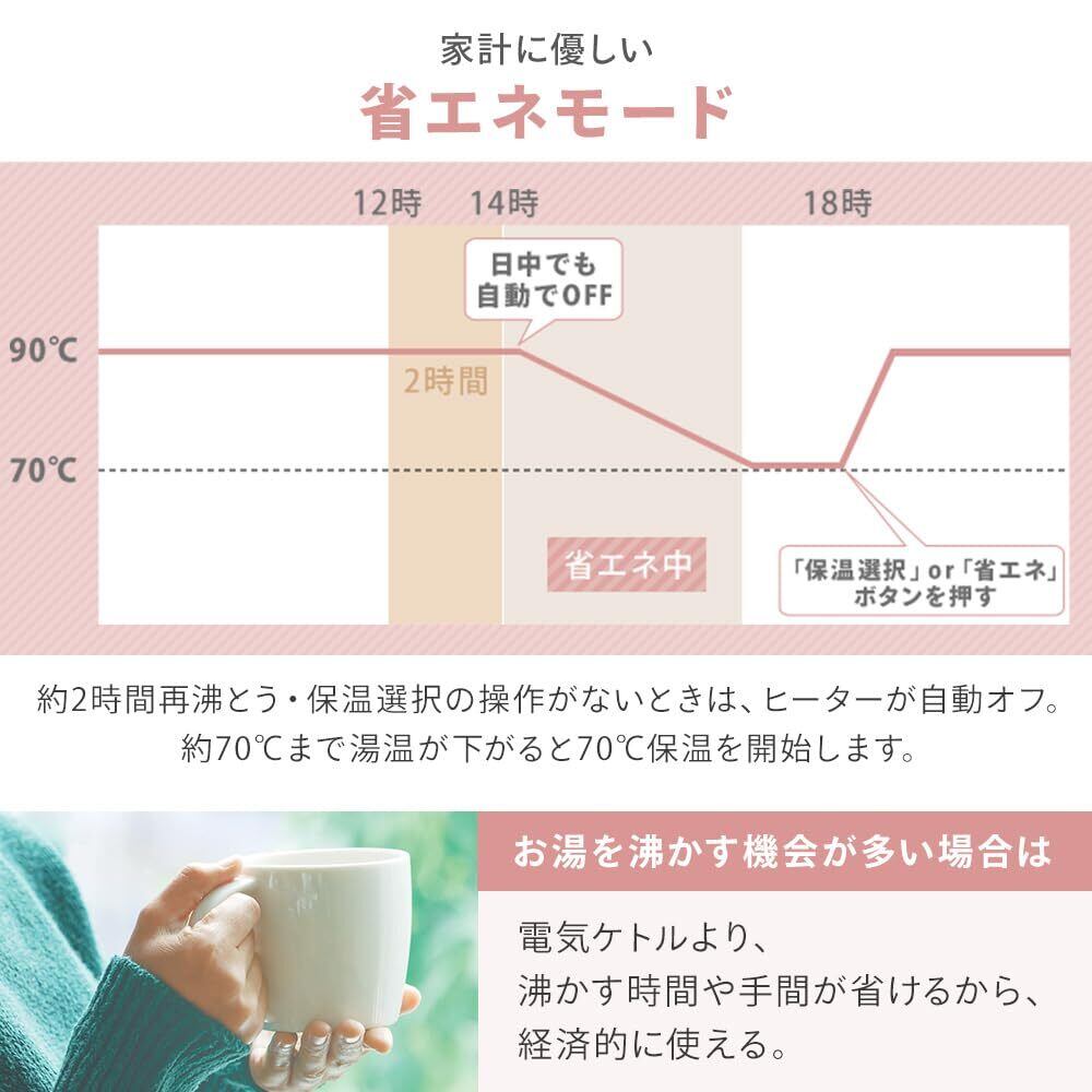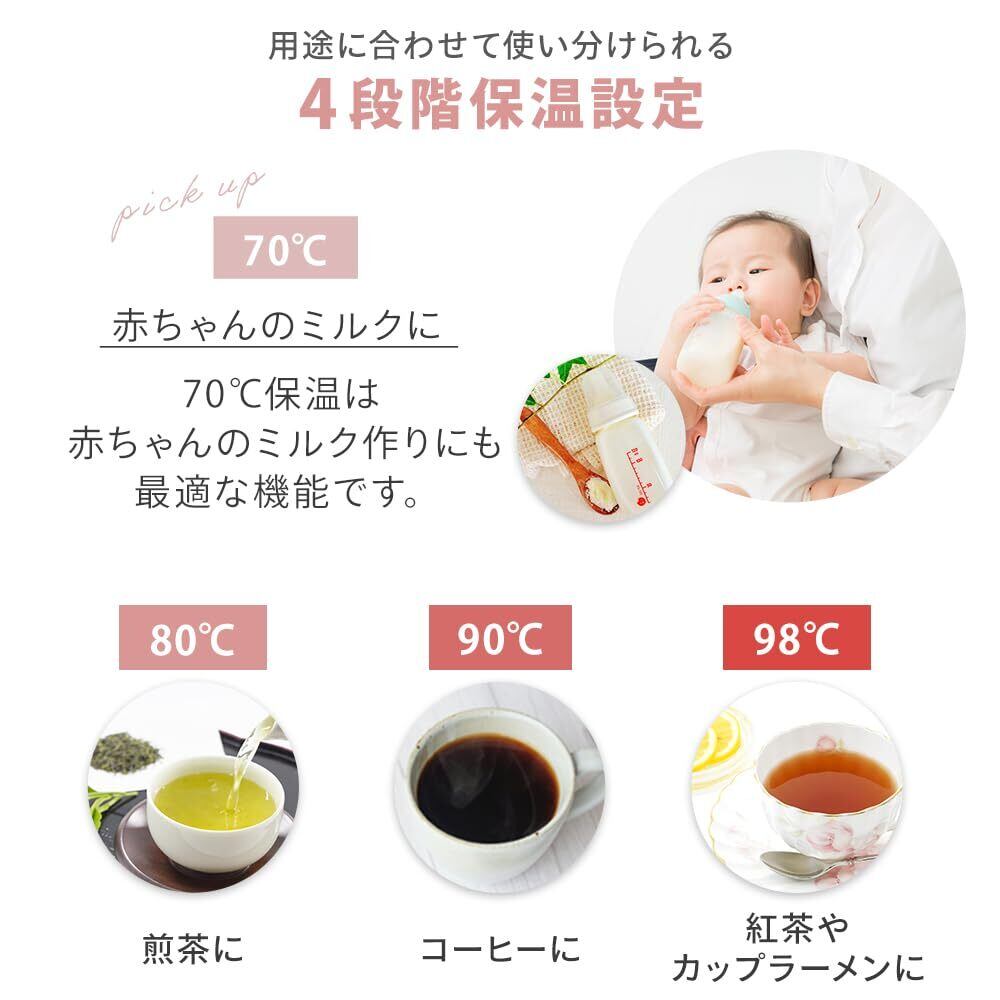 【使いやすいシンプル設計】用途に合わせて使い分けられる、保温設定 保温選択ボタンひとつで温度が変えられる簡単設定。 ◆ 保温や沸騰中の状態・残量も、一目で分かる 水位窓のガラス管が沸騰中は赤く、保温中は青く光ります。 状態がすぐに分かるから便利。 ◆ いつでも熱いお湯ができる、再沸とうモード 保温中のお湯を再沸とうし、カルキをとばします。 嫌なカルキ臭を軽減した、熱いお湯を使用できます。◆360°回転できるので、どこからでもお湯を注ぎやすい!