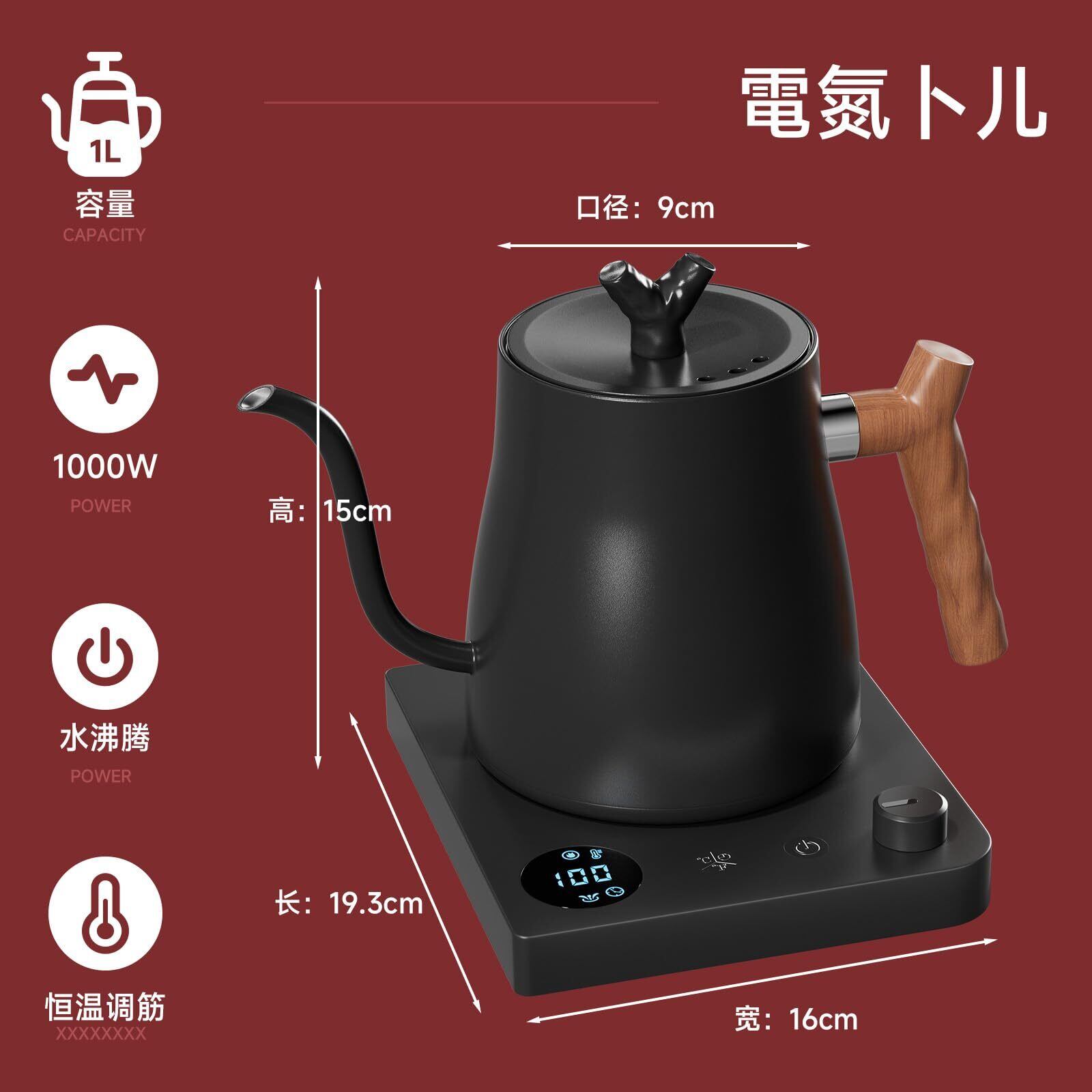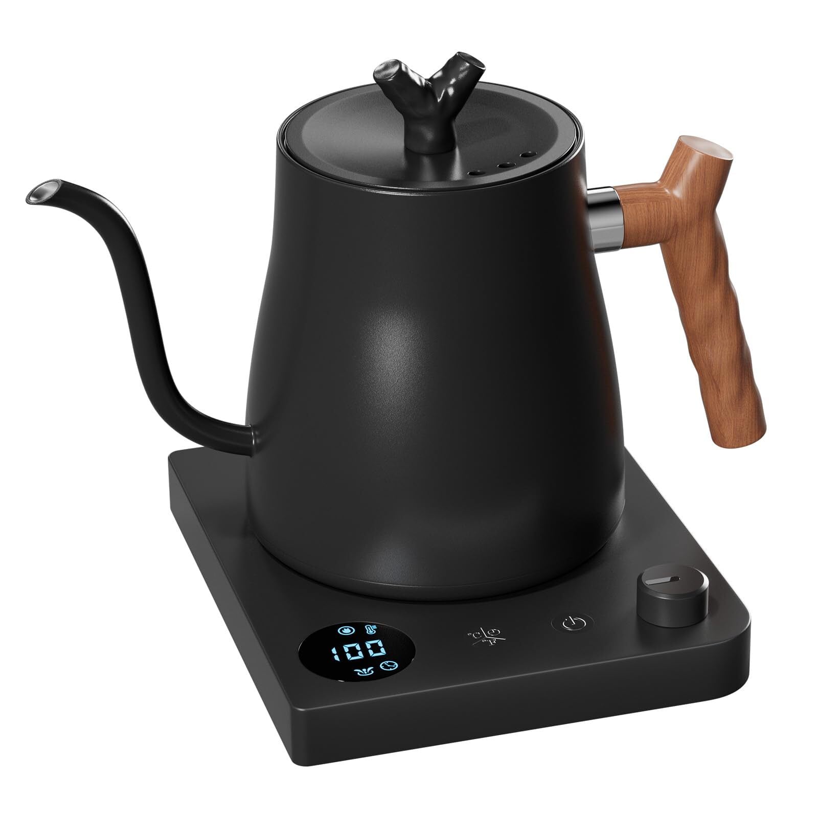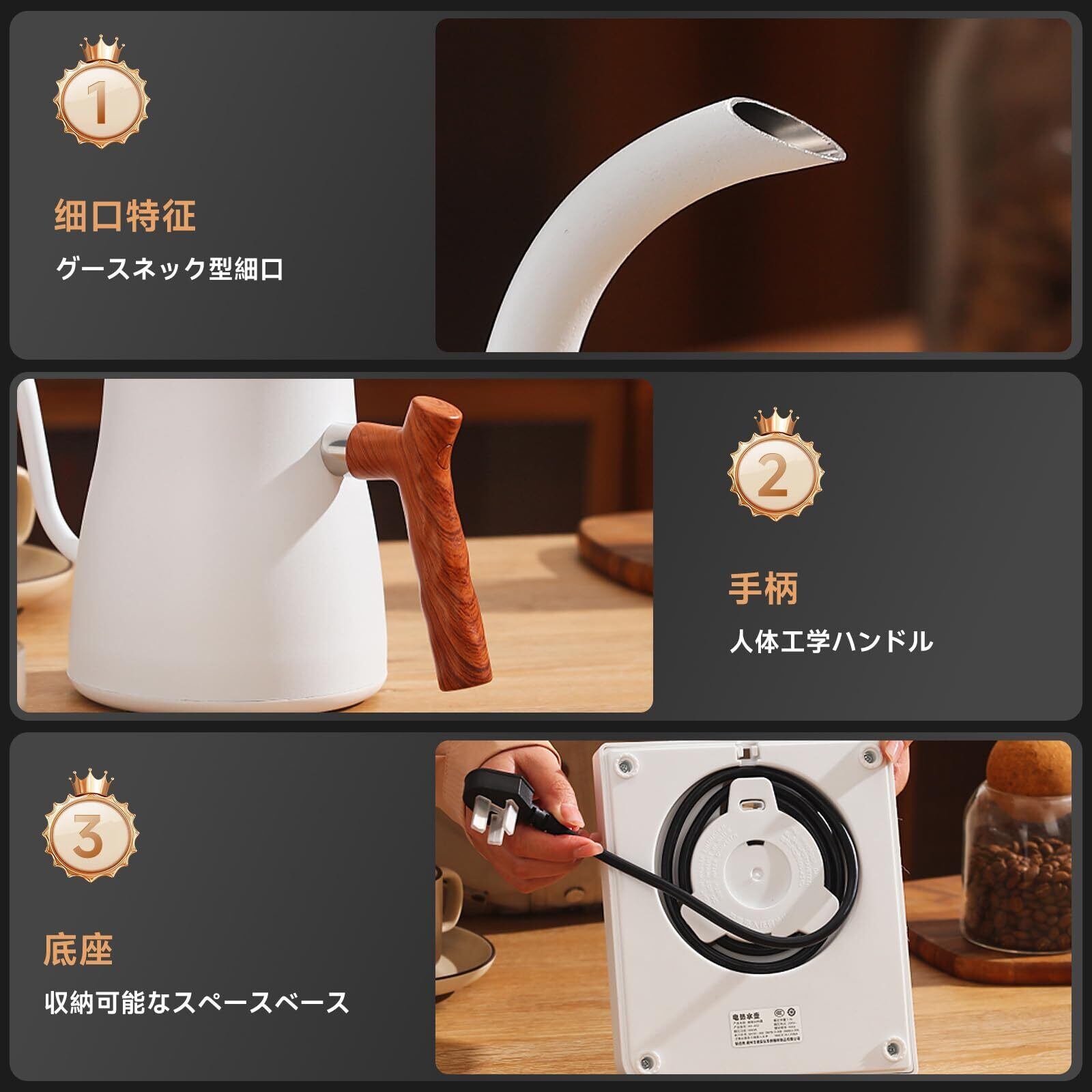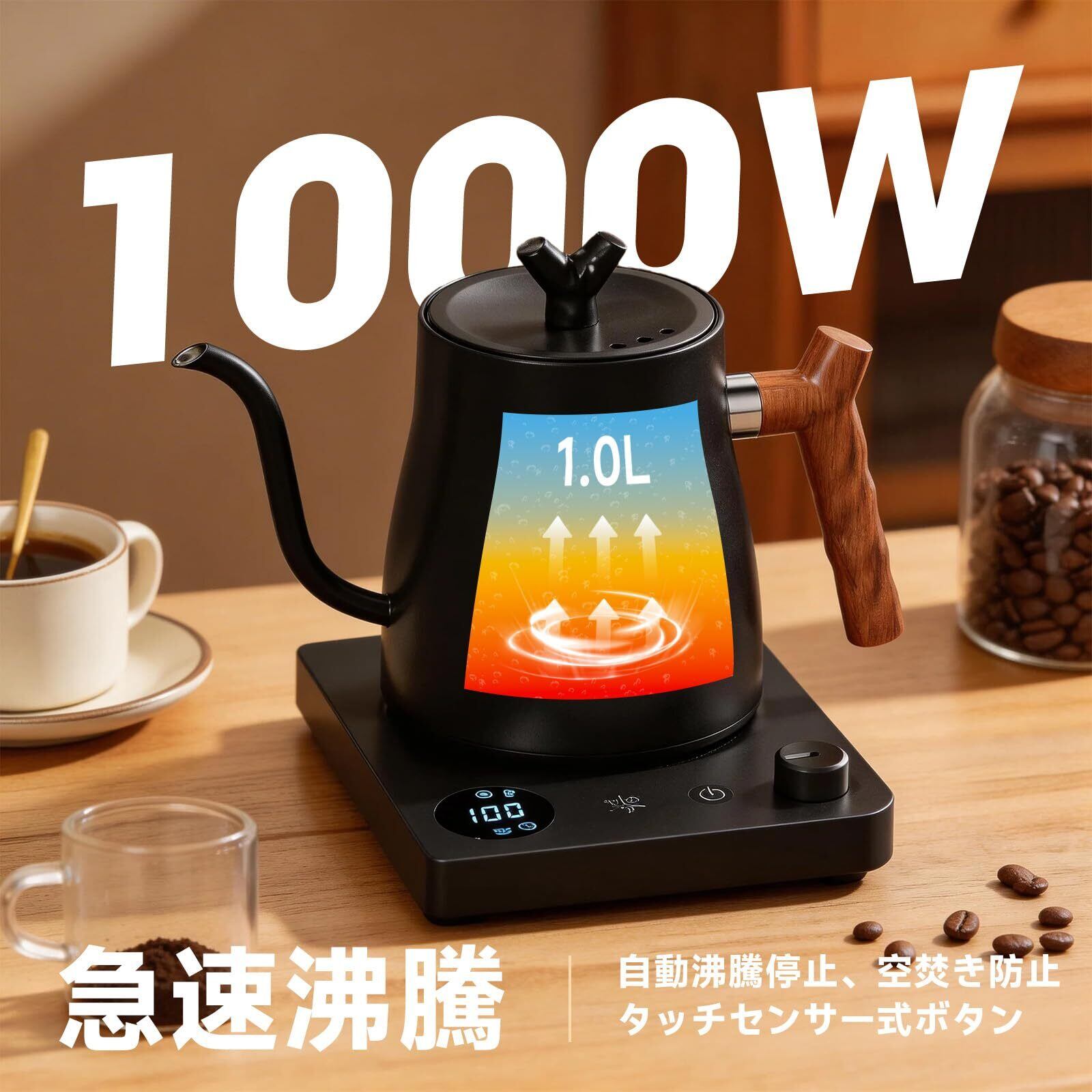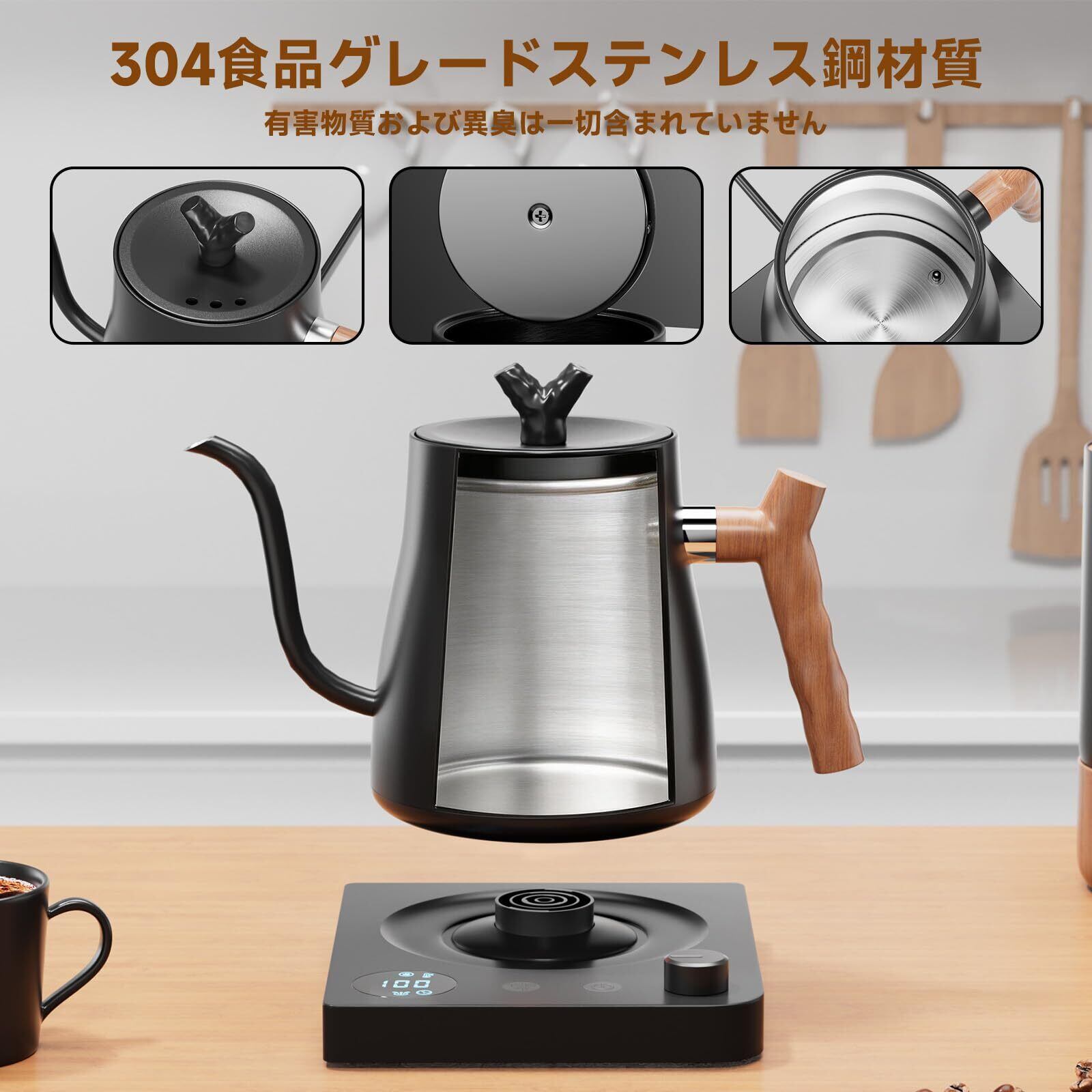 電気ケトル 1000W 素早い沸騰 細口ケトル コーヒー用 ドリップケトル 304ステンレス製内釜 保温機能付き 40〜100℃広範囲温度設定 温度調節つまみ付き おしゃれ キッチン家電 (ブラック-木目調ハンドル)