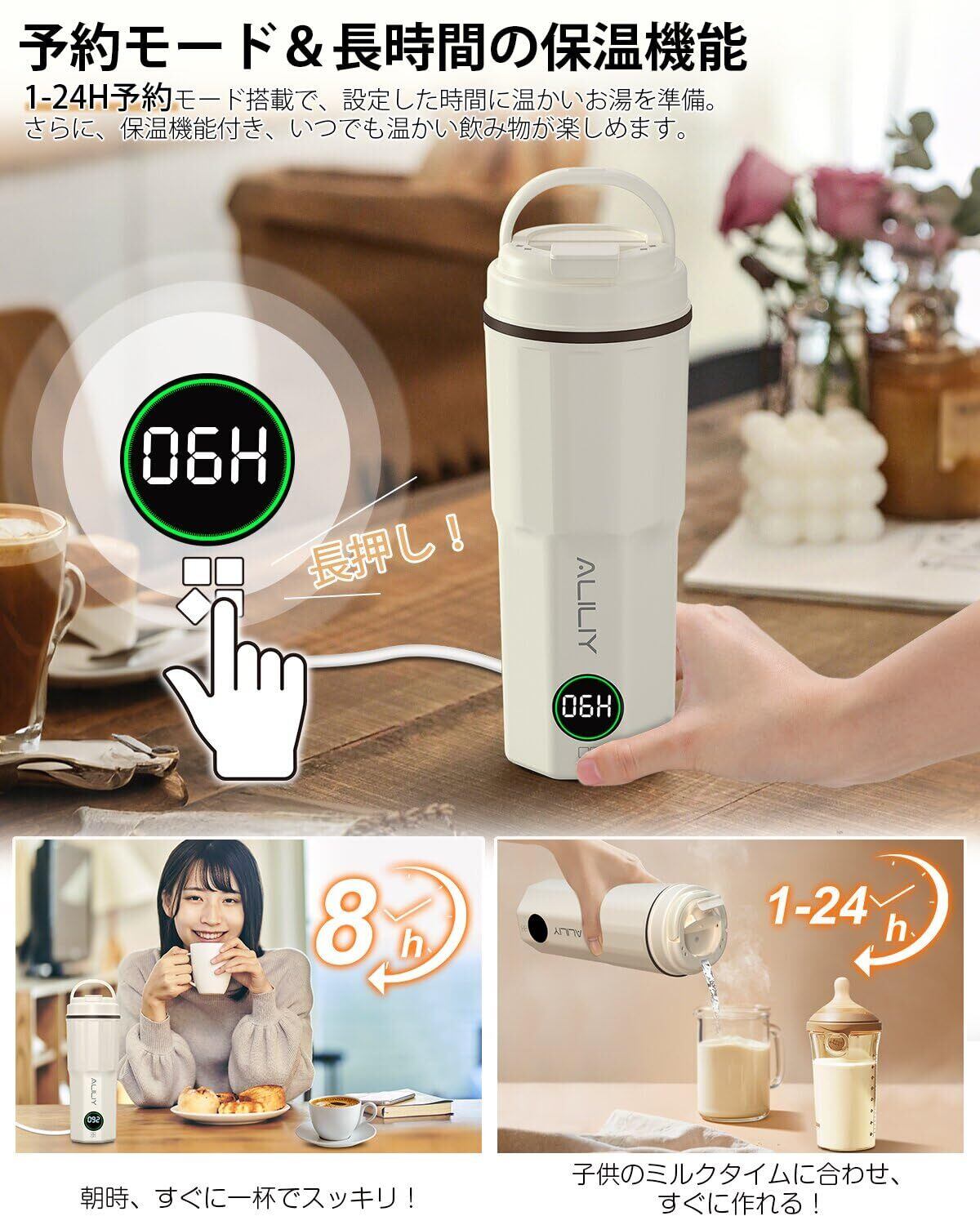 【1〜24時間予約設定で、いつでも理想のお湯】忙しい朝や仕事の合間でも、お湯を沸かす手間を省いてすぐに飲めるのが予約機能の魅力。1〜24時間の細かいタイマー設定が可能なので、就寝前にセットすれば、翌朝すぐに白湯やコーヒーを楽しめます。オフィスや育児シーンでも大活躍!必要な時にちょうどいい温度のお湯を用意できる便利でスマートなポータブル電気ケトル。*電源コードが必要。