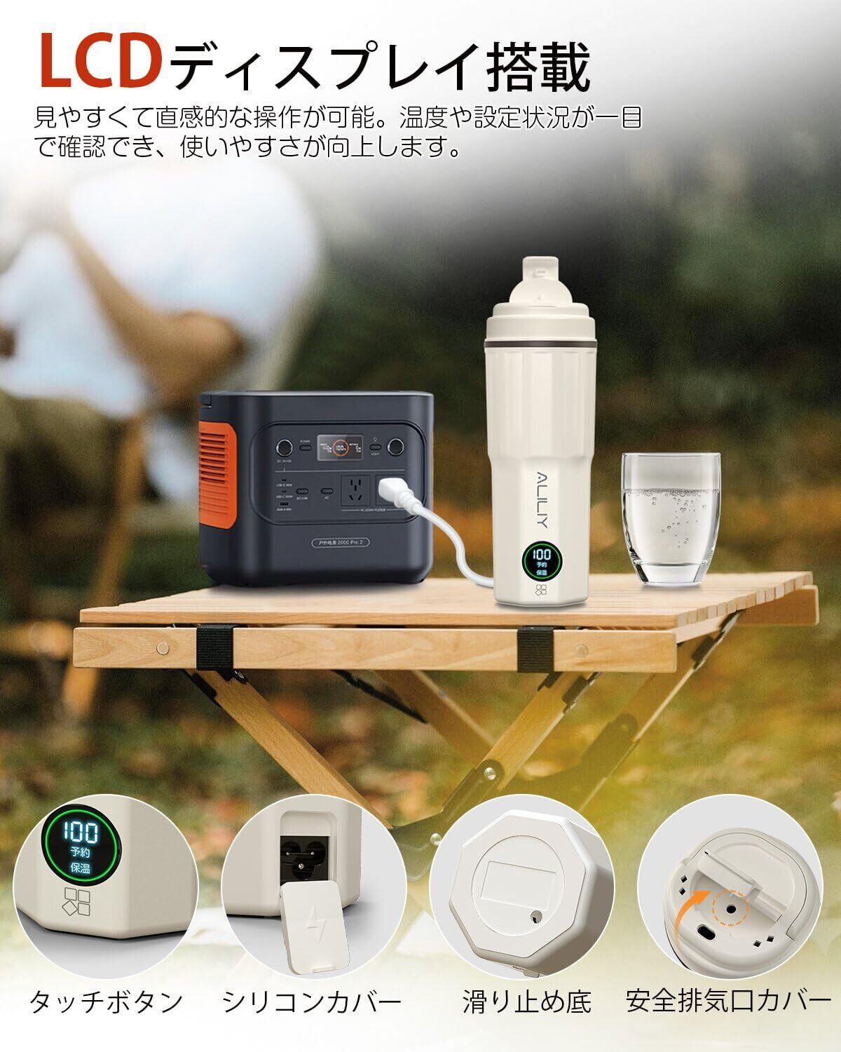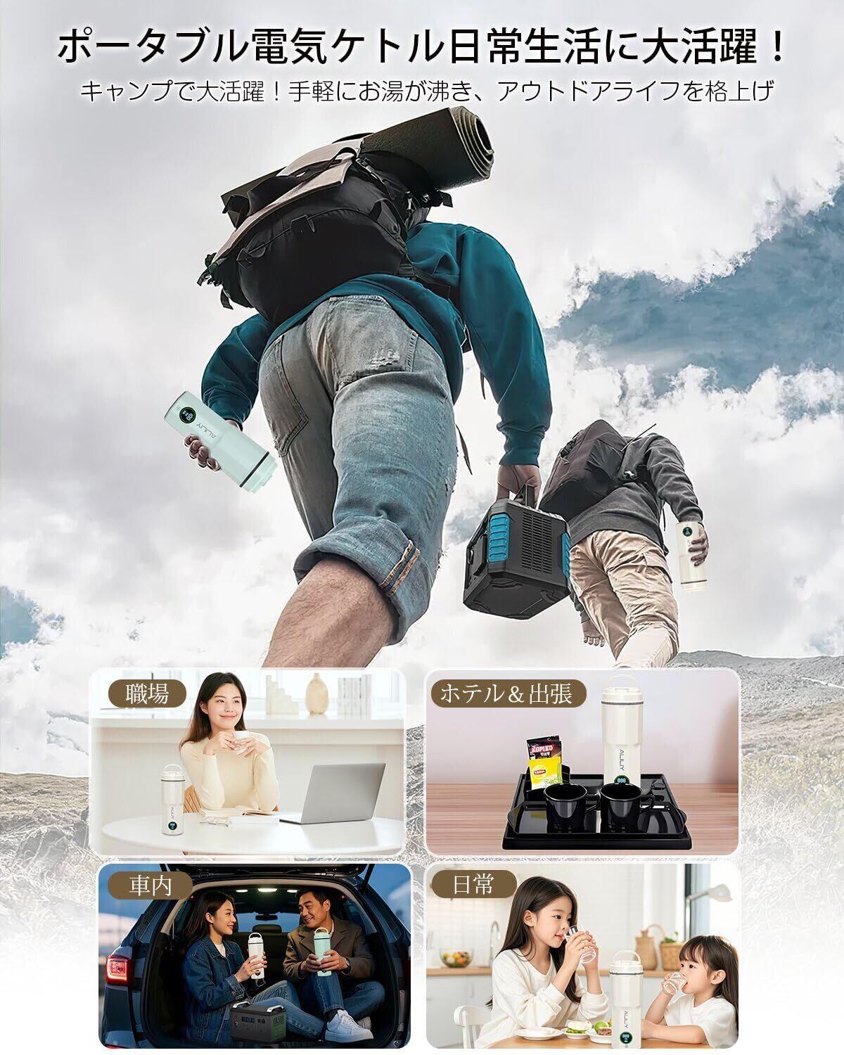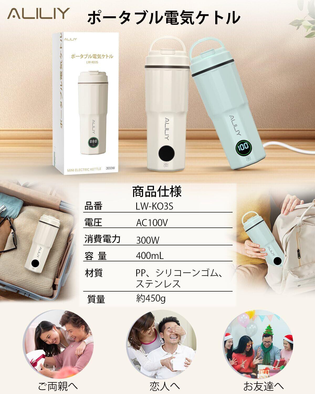 【3.0時代へ進化!小型電気ケトルで自由な水生活を】個人向け・専用のALILIY ポータブル電気ケトル。日常生活に適切な水分補給は体の調子を整え、集中力を高め、健康的な生活を支えてくれます。1.0時代の家庭用電気ケトルは自宅のみで使用、持ち運びに不便。また2.0時代のワンタッチ式小型ケトルは小型で便利ですが、水を100℃だけ沸騰させて、温度調節ができません。今度3.0時代スマート携帯電気ケトルは利用し、個人向けの水生活を楽しもう!