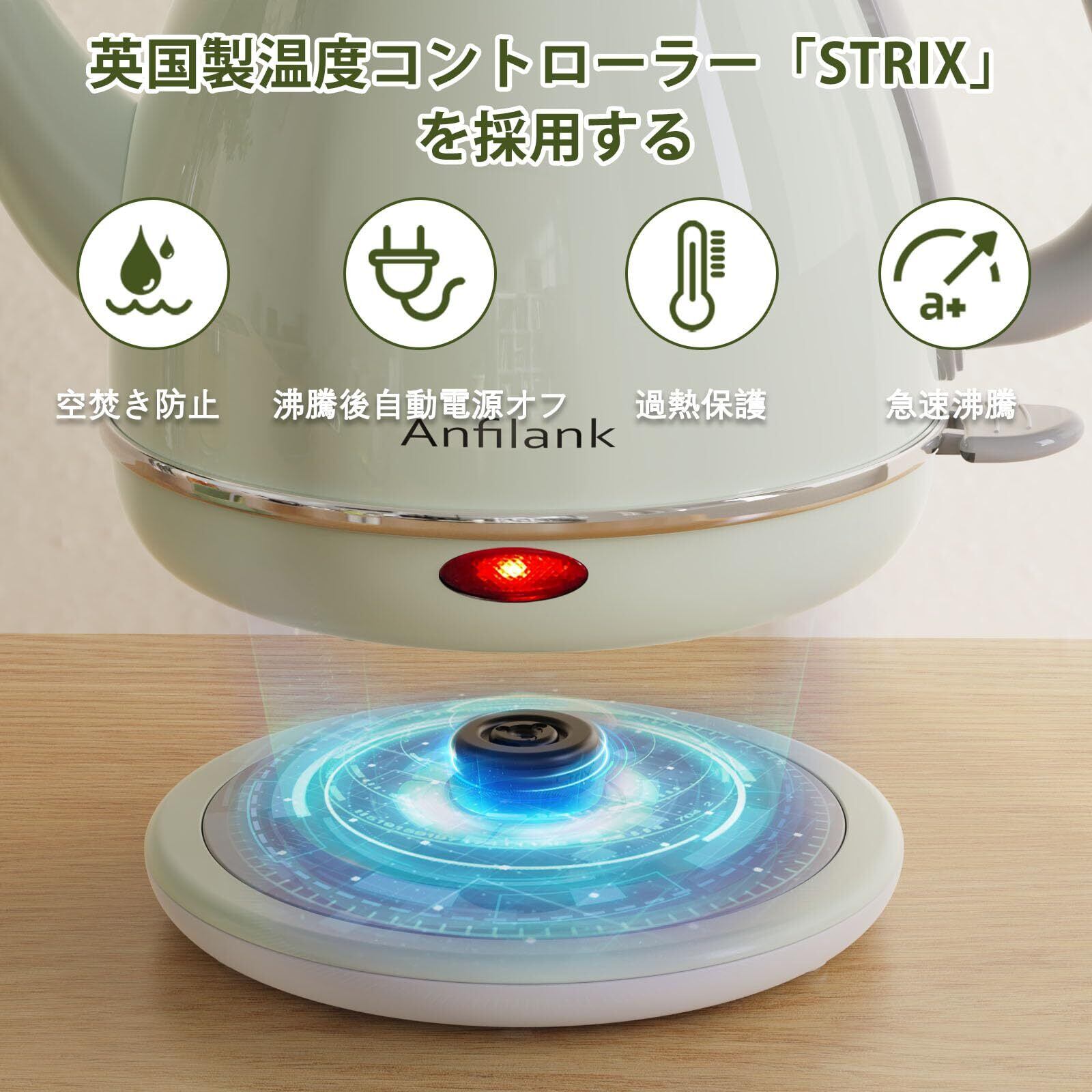 【三重保護・安全の空焚き防止機能付き】Anfilankおすすめ電気ケトルの中核部品には、12,000サイクル以上の寿命を持つ世界最高水準の英国製温度コントローラー「STRIX」を採用します。沸騰後自動電源オフ、過熱保護、空焚き防止、安全安心にご利用いただけれます。空焚き防止機能付きだから、家事などの他の作業をしながら安心してお湯を沸かすことができます。沸かし終わったら自動で電源が切れるので、安全です。