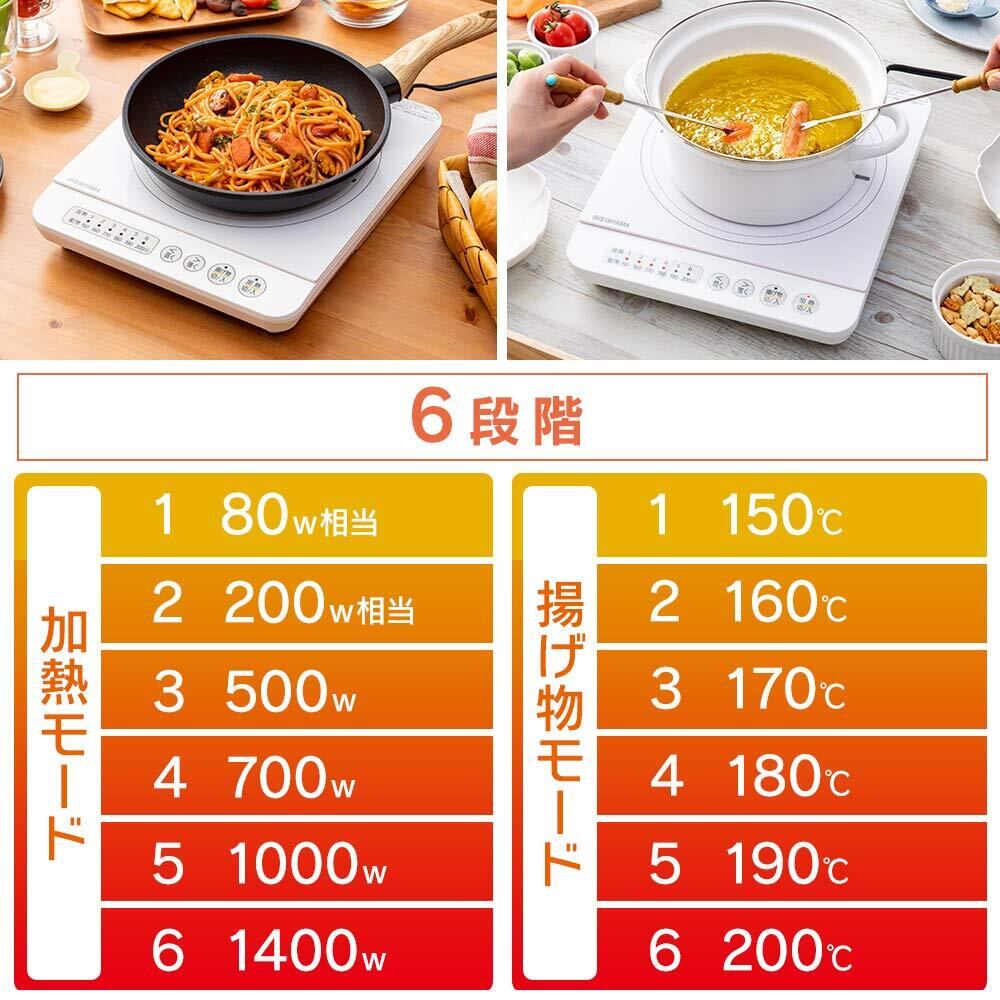 最大火力1400Wのハイパワーと、2種類のモード(加熱・揚げ物)で、料理の幅が広がります。さらに、低騒音化設計で気になる運転音を抑えて静かに調理ができる点がメリット◎