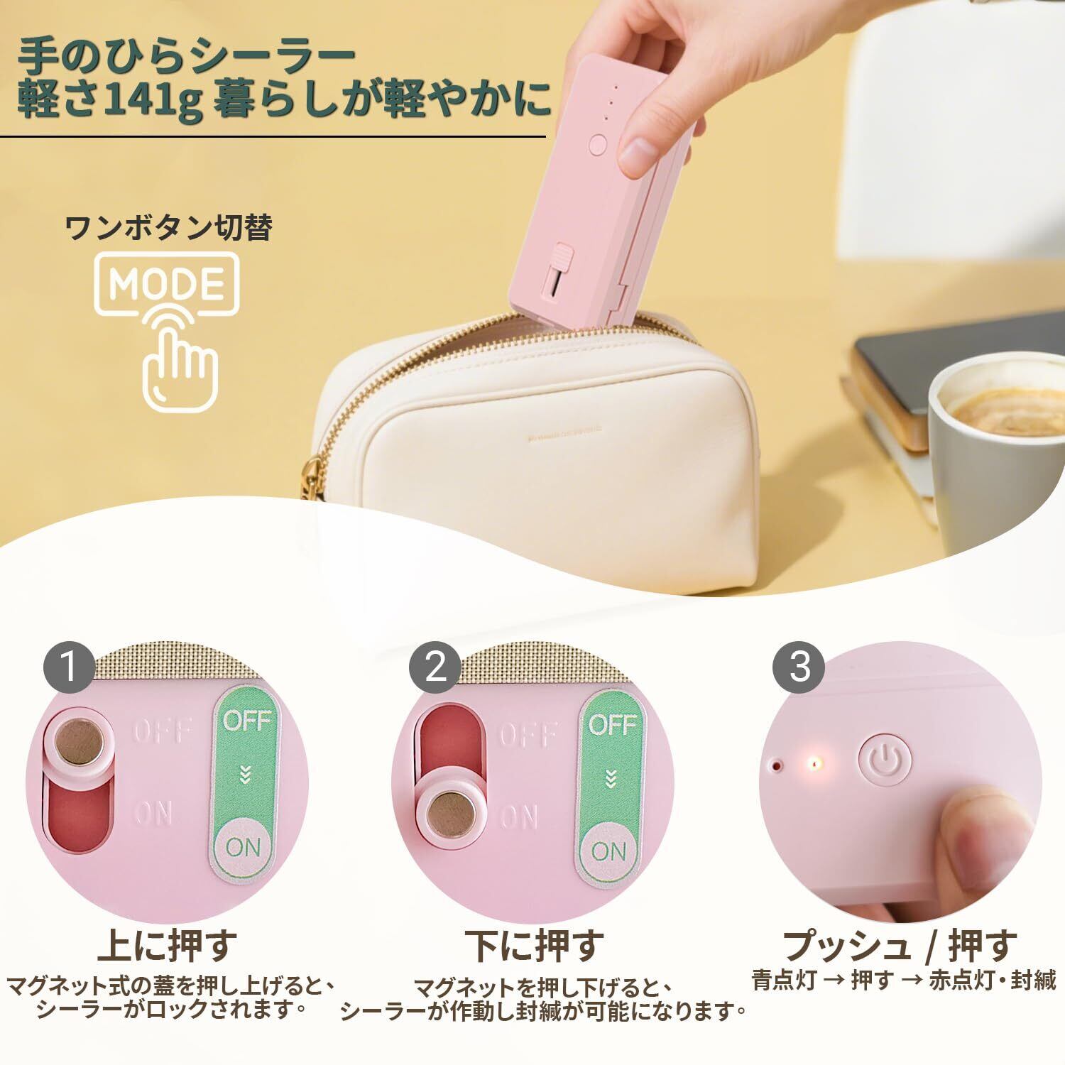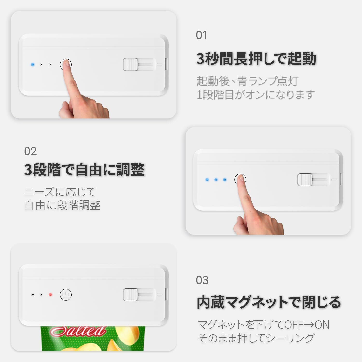 【三階段調整&操作簡単】 専用袋が不要な3段階温度調整機能を搭載し、薄手のポリ袋から保存容器用パウチまで幅広い素材に対応。電源ボタンを3秒長押しで起動すると自動的に弱モード(1段階)に設定され、本体上部のヒートプレートを押すたびに「弱→中→強」と段階が切り替わる直感的設計。上蓋のヒートプレートを押して加熱している間はLEDインジケーターが赤く点灯し、手を離すと即座に動作停止する安全機構を採用。面倒な設定不要で、スイッチ押圧→温度選択→密封完了という3ステップが5秒で完了する、初心者でも瞬時に習得可能なシンプル構造です。