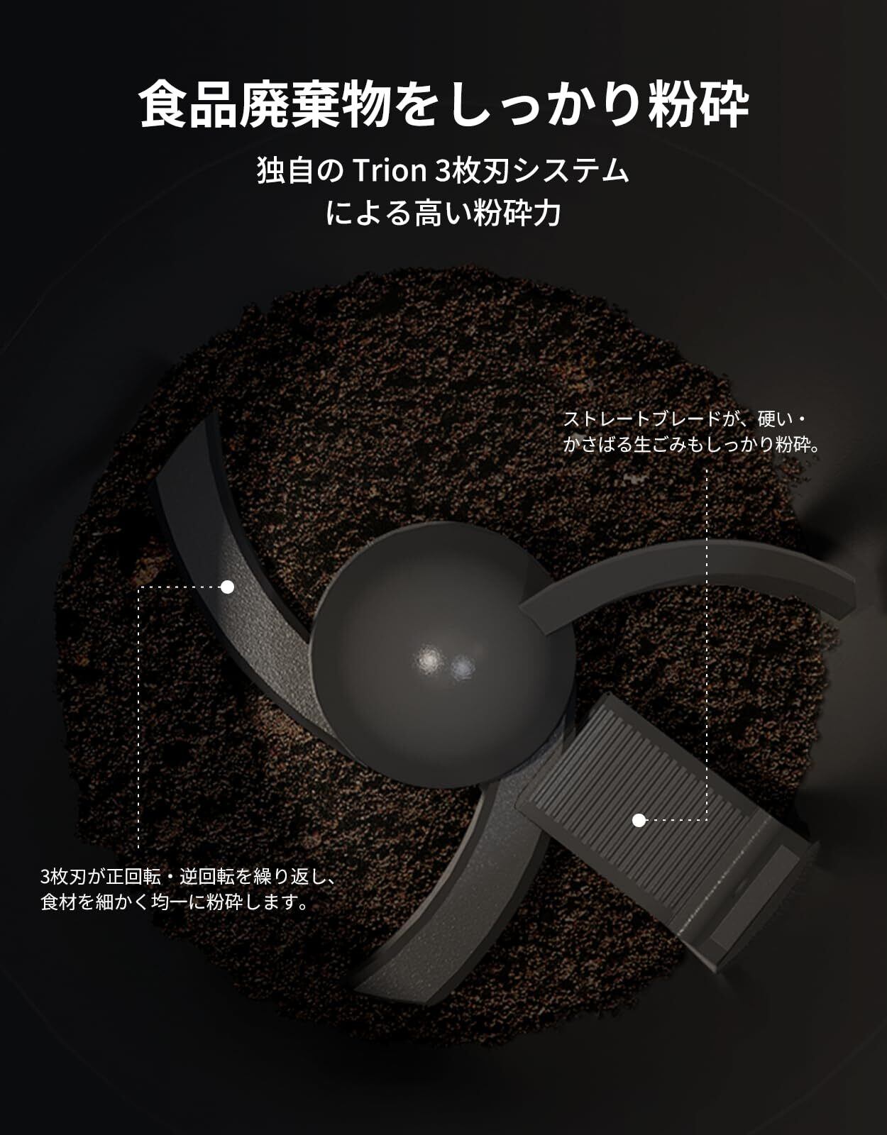 【乾燥×粉砕方式】 ブレードによる粉砕と温風乾燥を同時に行い、生ごみの体積・重量を抑えることで、ゴミ出し時の負担軽減に役立ちます。(注意事項※本製品は生ごみ処理機です。投入できない物(硬い骨・殻類など)があります。※実際の処理時間・処理結果は使用環境や投入内容により異なります。※自治体によっては生ごみ処理機購入に対する補助金制度が利用できる場合があります。詳細は各自治体の案内をご確認ください。)