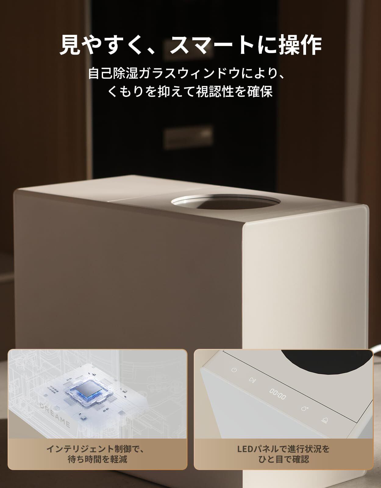 【静音設計】 作動音を抑えた設計のため、キッチンやリビングなど生活空間でも使いやすく、夜間や就寝中の使用にも配慮しています。