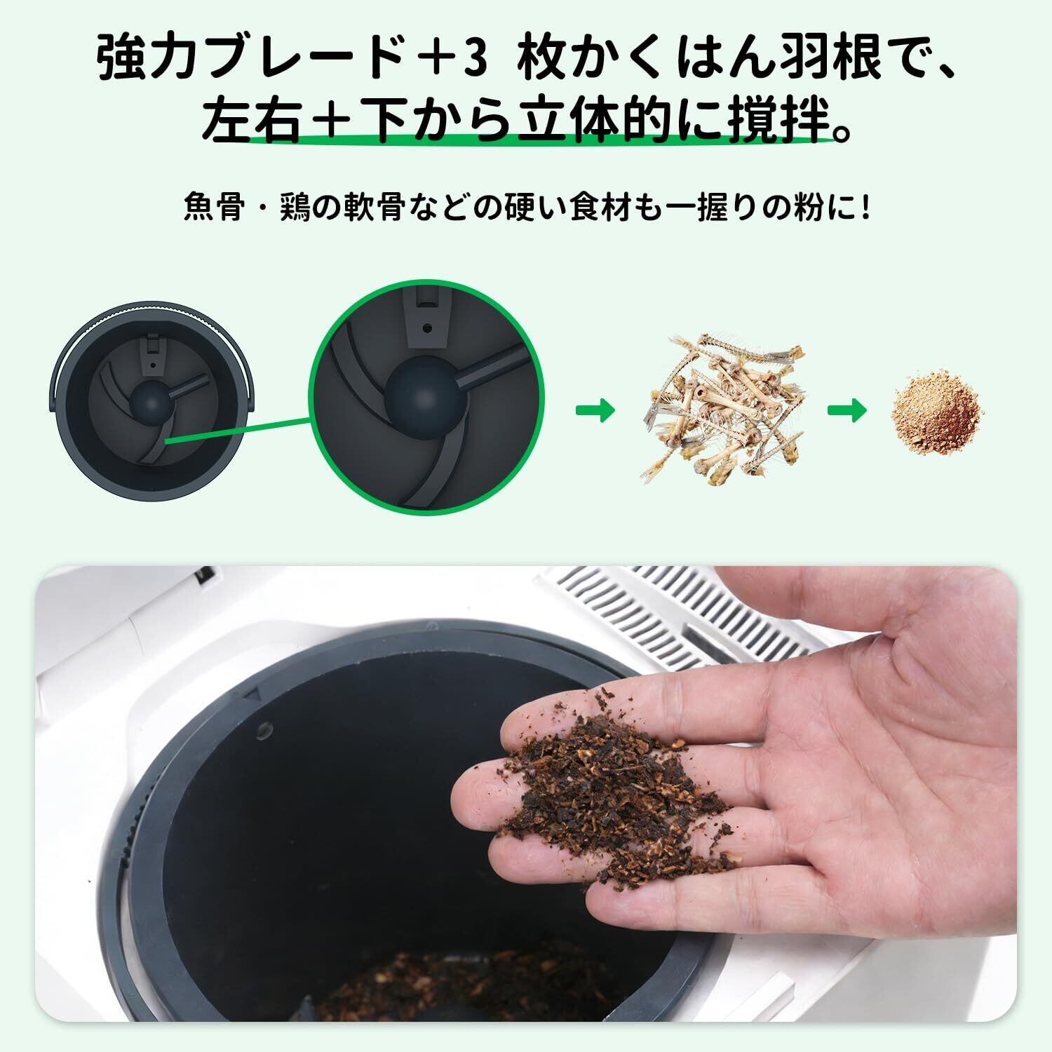 【生ゴミの体積を最大90%削減!】 強力な粉砕と乾燥機能により、魚や鶏の小骨、軟骨もスムーズに処理できます。 これにより、生ゴミのかさが大幅に減少し、ゴミ出しの回数もぐっと減ります。 毎日のゴミ出しが楽になり、環境にも優しい選択です。 ※なお、硬い骨や貝殻、多量の油分には対応しておりませんので、あらかじめご了承ください。