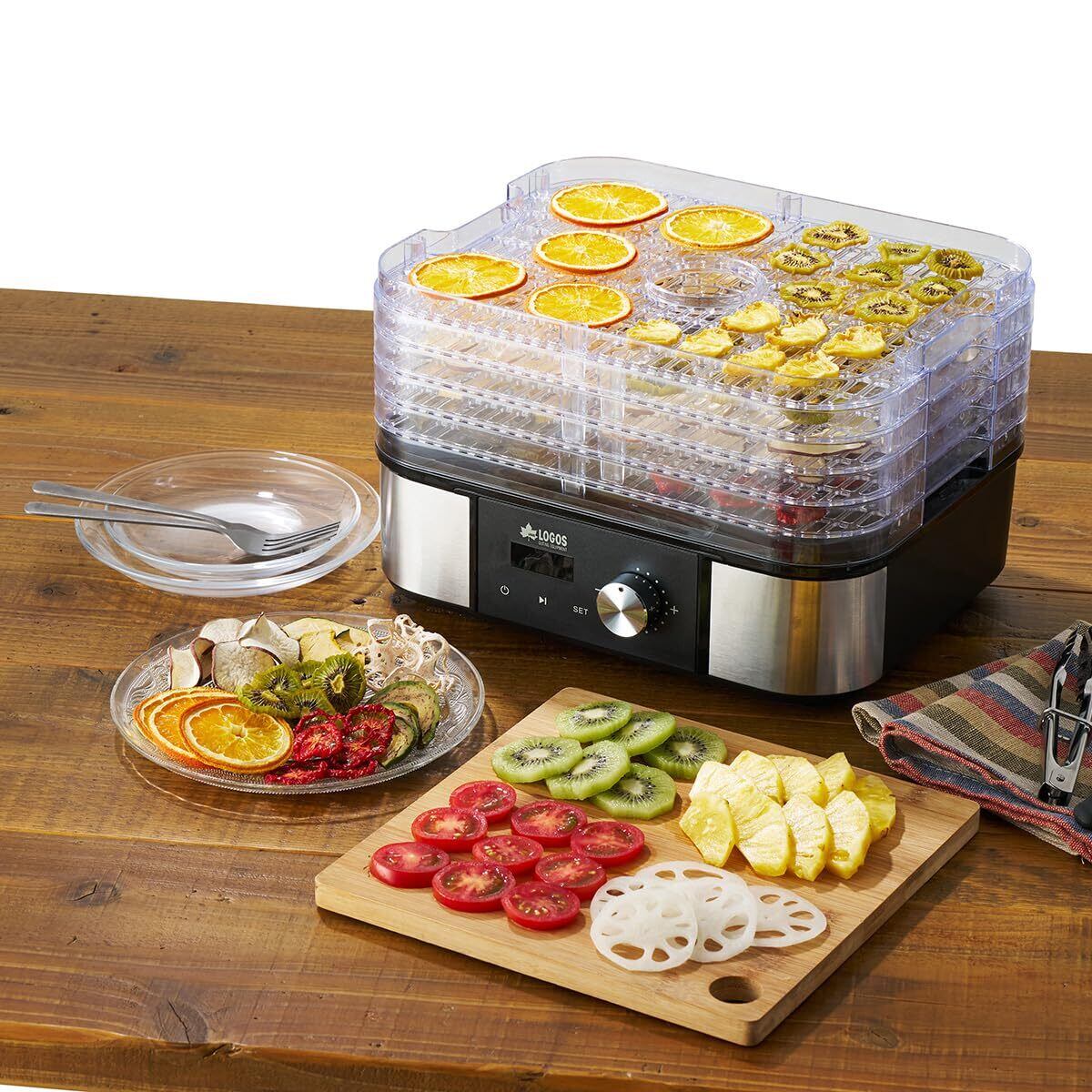 主素材:ステンレス、AS、PP 性能/特長: ・キャンプで手軽に干物調理ができる!中身が見えるフードドライヤー。 ・透明のトレイ5段式で一度にたくさんの調理が可能。 ・ダイヤルで温風の温度が調整できる。 ・タイマー機能付きで、食材によって乾燥させる時間を調整できる。
