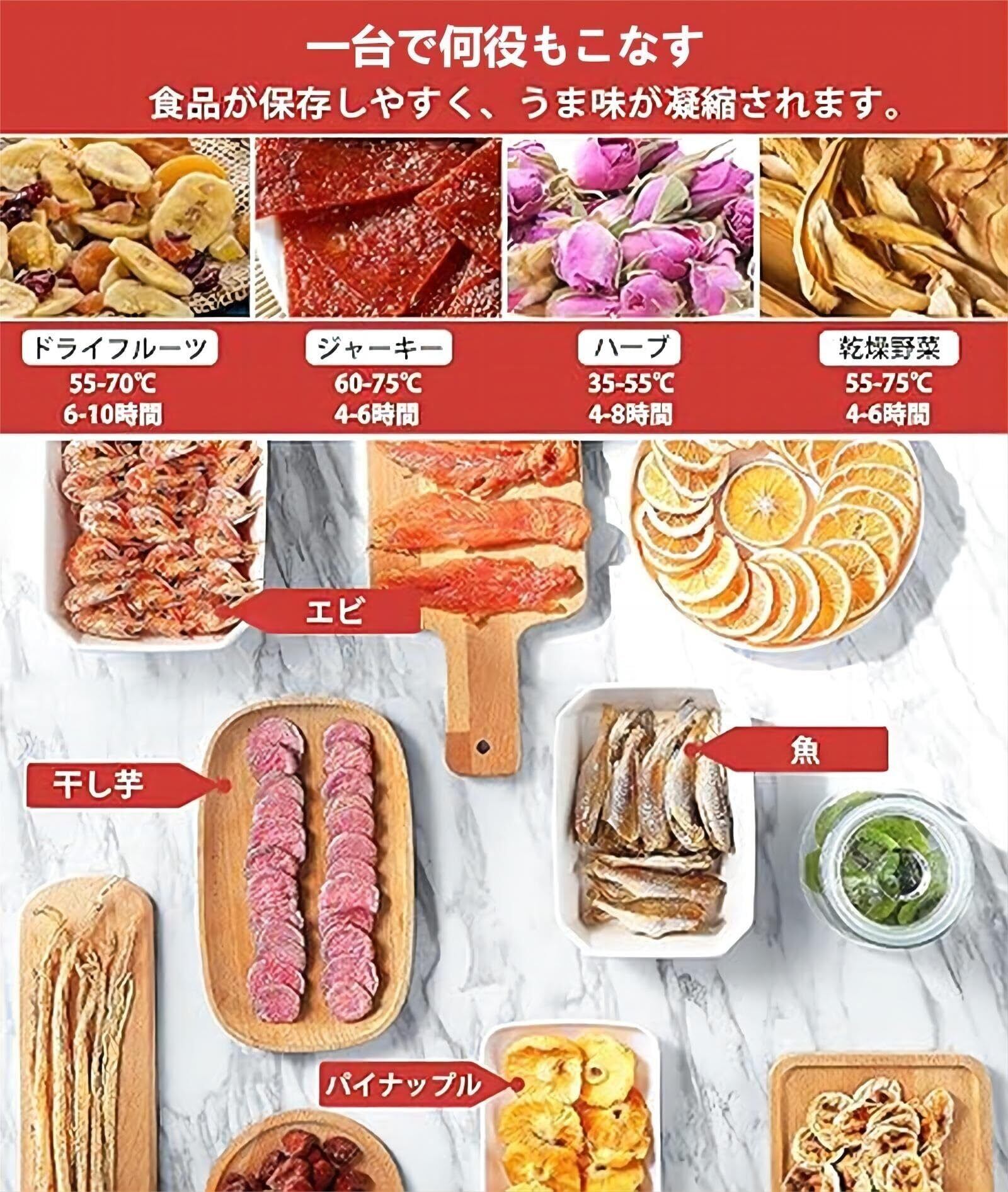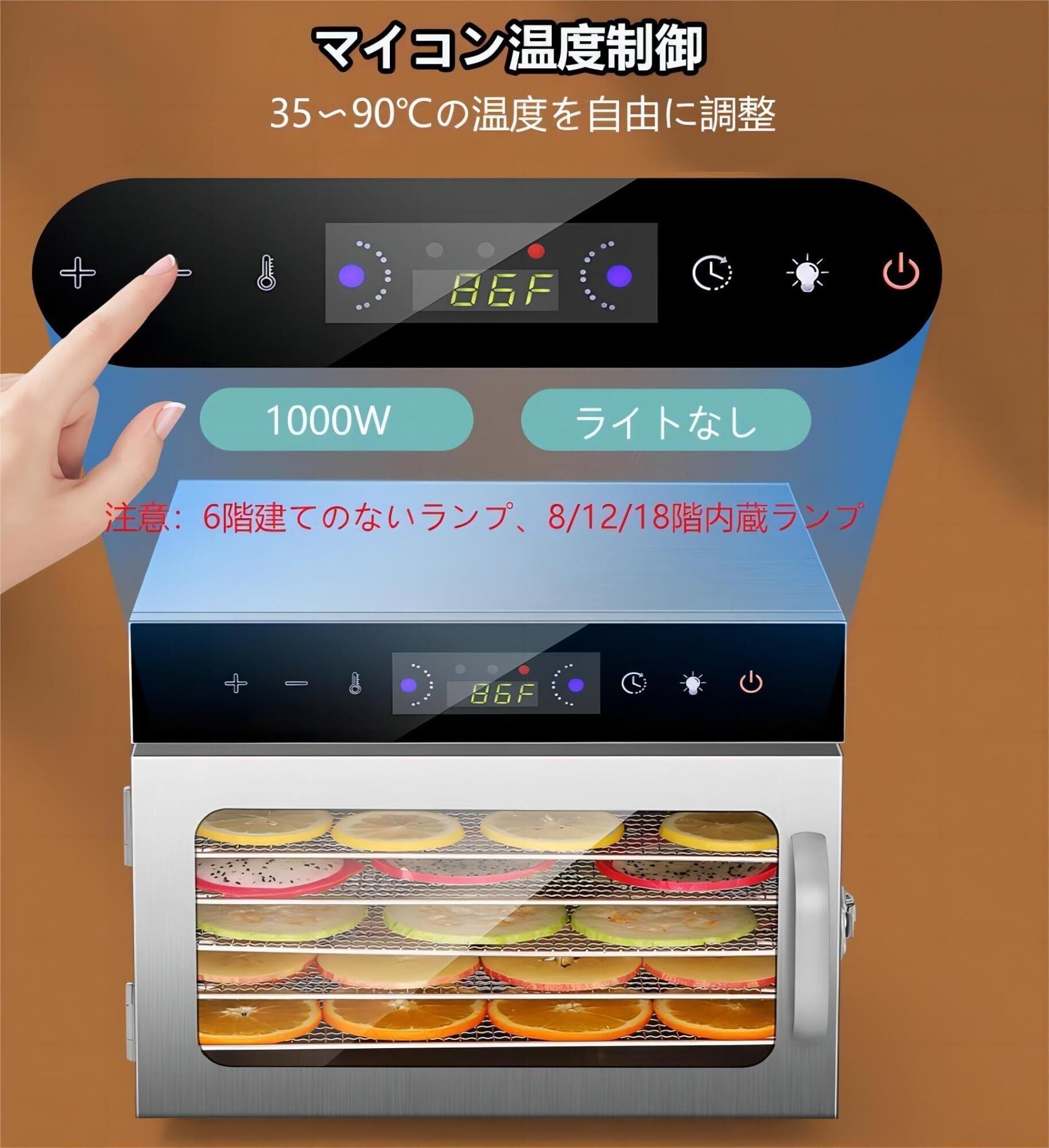 【LEDスマートタッチパネル】:フードドライヤーの動作時間を0~24時間に設定でき。温度設定范囲は30℃~95℃で、5℃単位で調整します。この温度と時間調整范囲は98%の乾燥需要を満たすことができます。