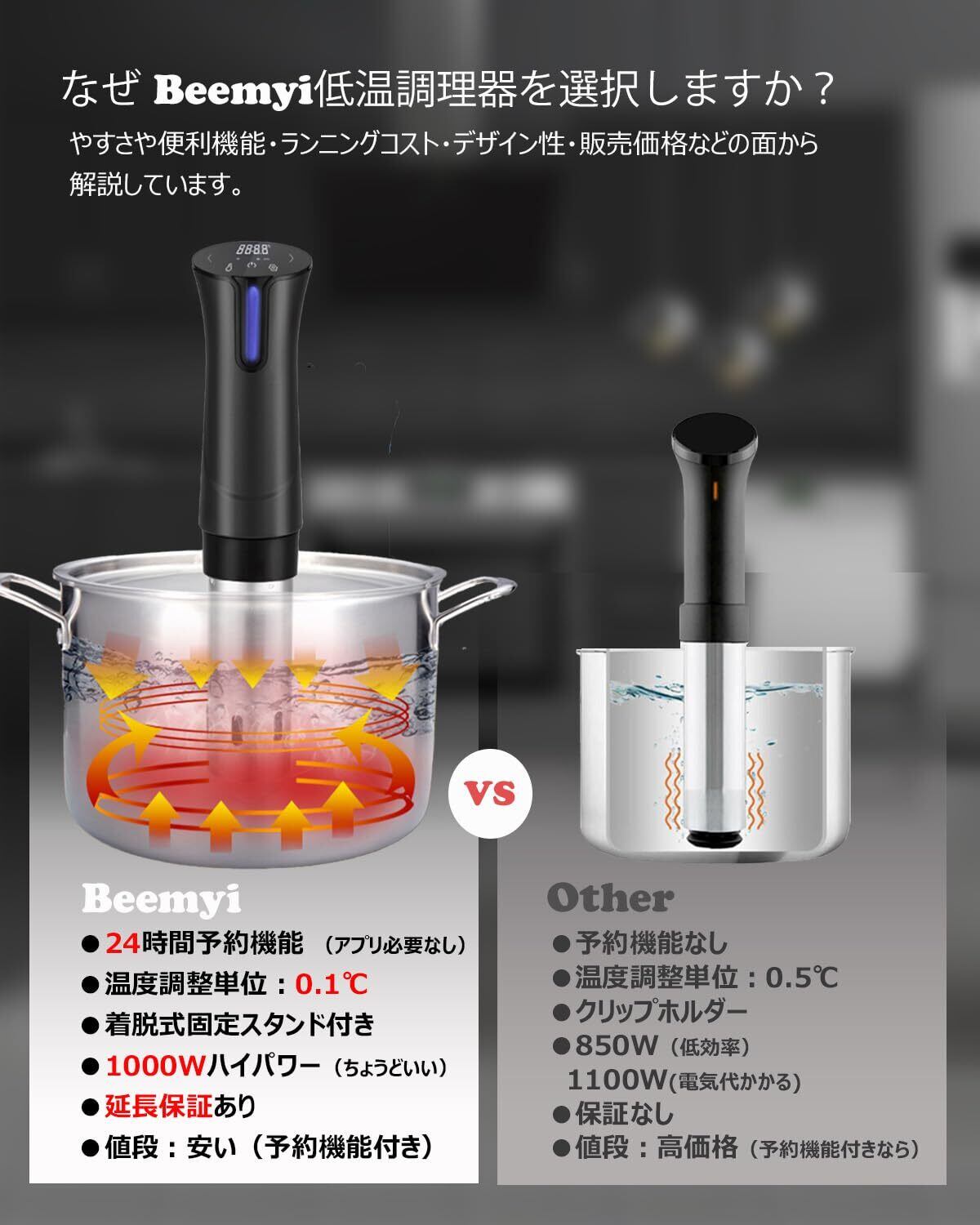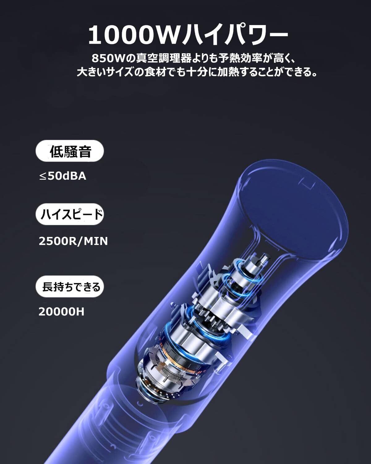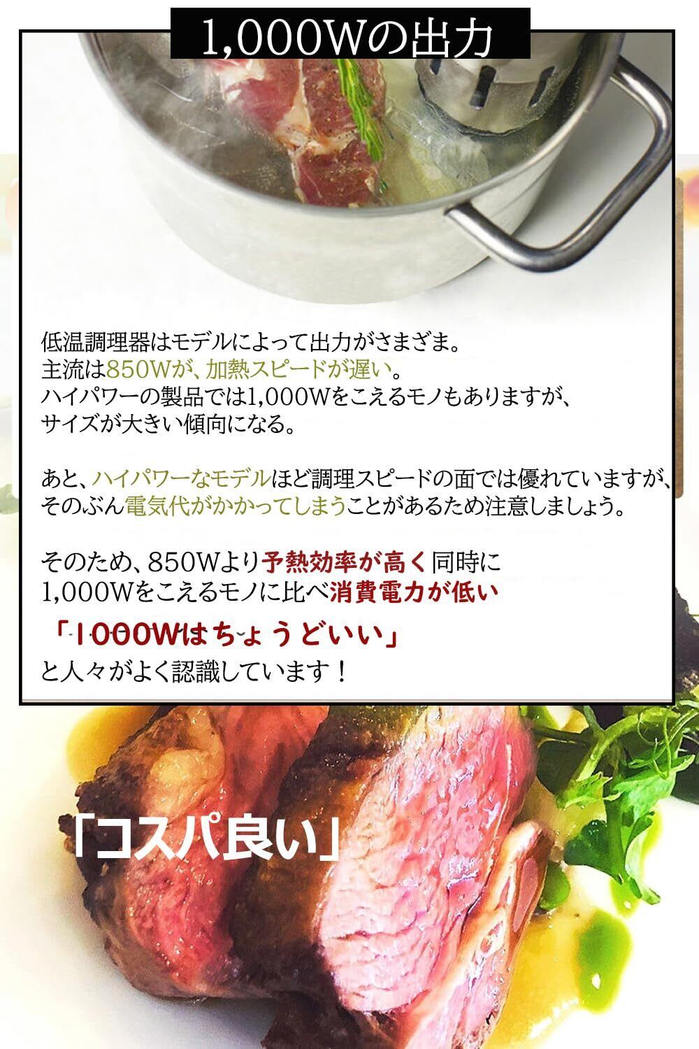 【1000Wハイパワー】1000Wハイパワーで予熱効率が高く、大きいサイズの食材でも十分に加熱することができる。また、1000W低温調理器は850W低温調理器より予熱効率が高く同時に1100Wの低温調理器に比べ消費電力が低い。