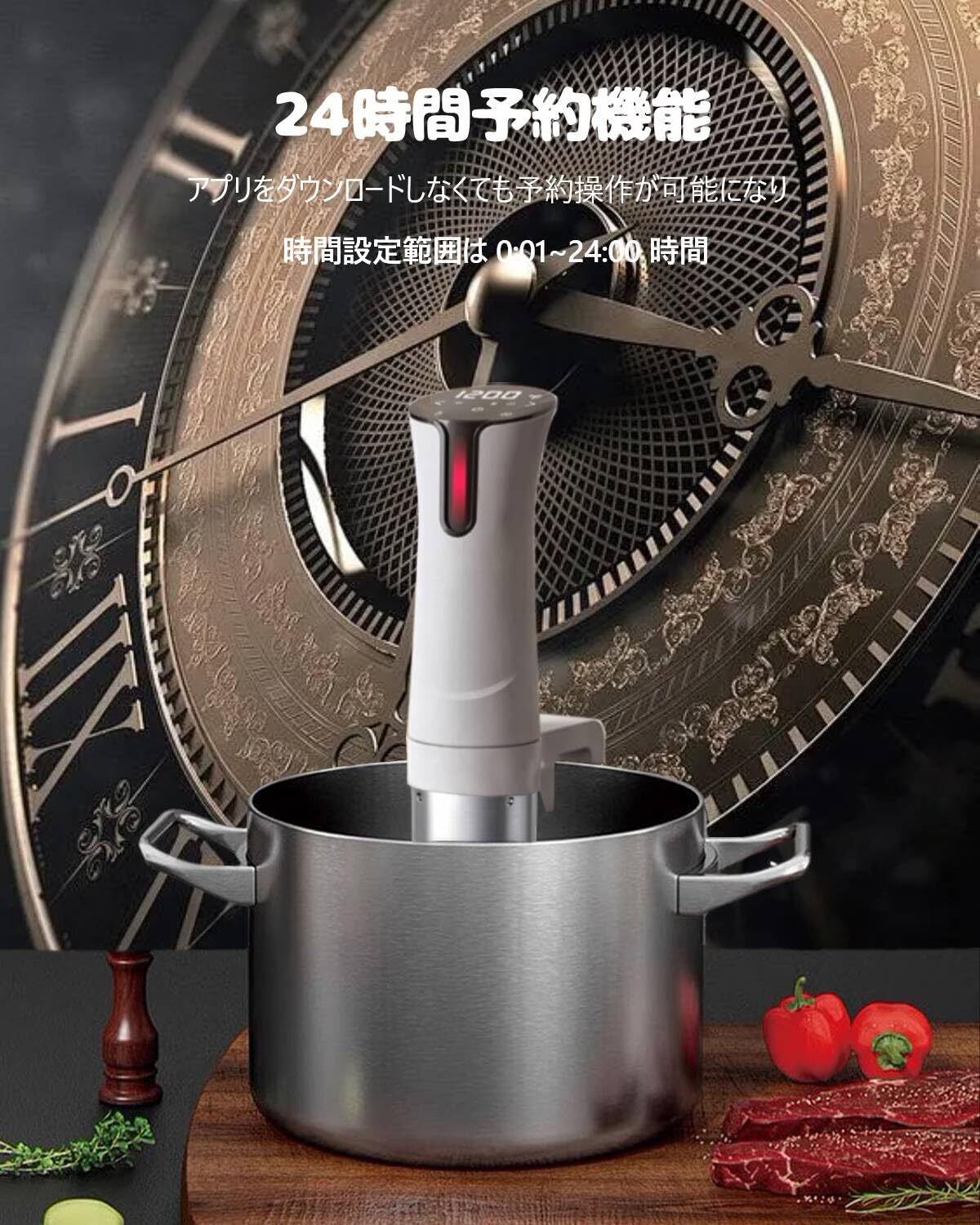 【24hプリセット機能付き&保温調理】プリセット機能は24時間以内の稼働開始の機能を提供でき、予約設定が完了すると、低温調理器が自動的に起動します。就寝前や出勤前に予約をして、起床後や帰宅時にすぐ食べられます。また1分から99時間59分までの保温時間設定できるため、保温鍋がなくても保温調理もぱっちりできます。