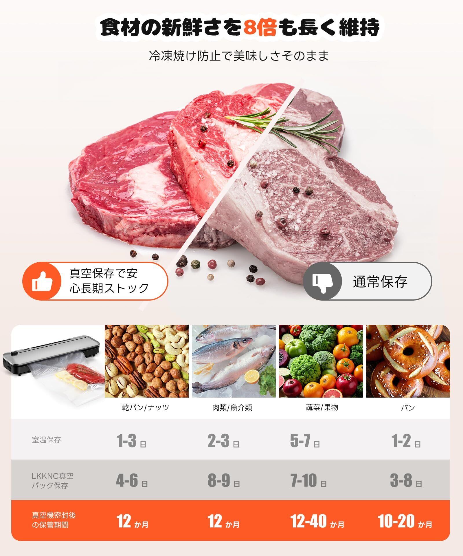 【ワンタッチ操作&LED表示・コンパクト設計&お手入れ簡単】一键操作で誰でも簡単に使用可能。LEDディスプレイに作業カウントダウンが表示され、進行状況を一目で把握できます。本体サイズは39×10.2×6.8cmのコンパクト設計で、キッチンのカウンタースペースを50%以上も節約。その小ささで収納に便利で、戸棚や引き出しにもすっきり収まります。ABS素材を採用し、表面の汚れを簡単に拭き取れて清潔を保てます。LKKNC真空機は、あらゆる家庭のキッチンに置いておきたい必須ツールです。
