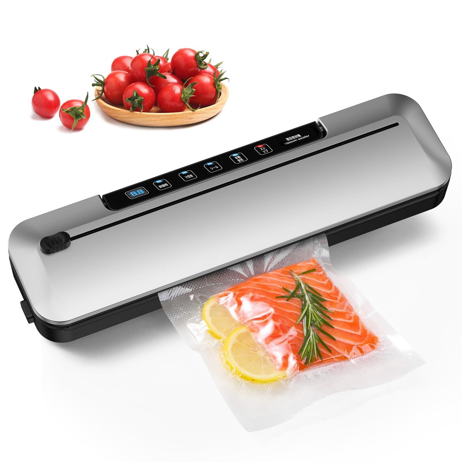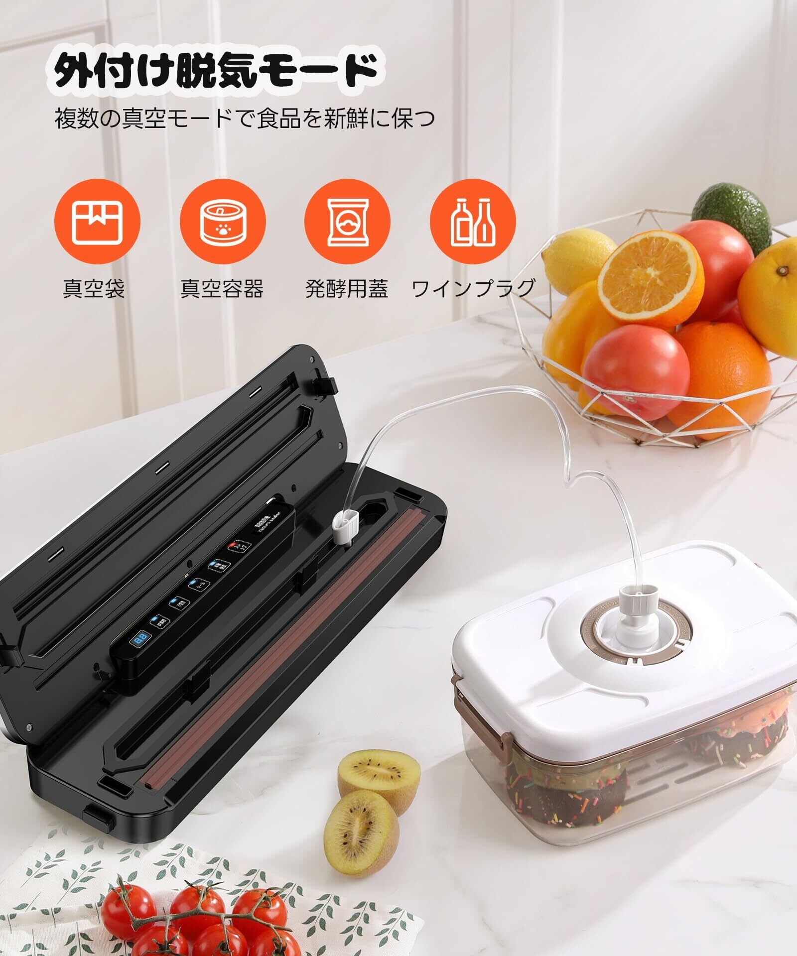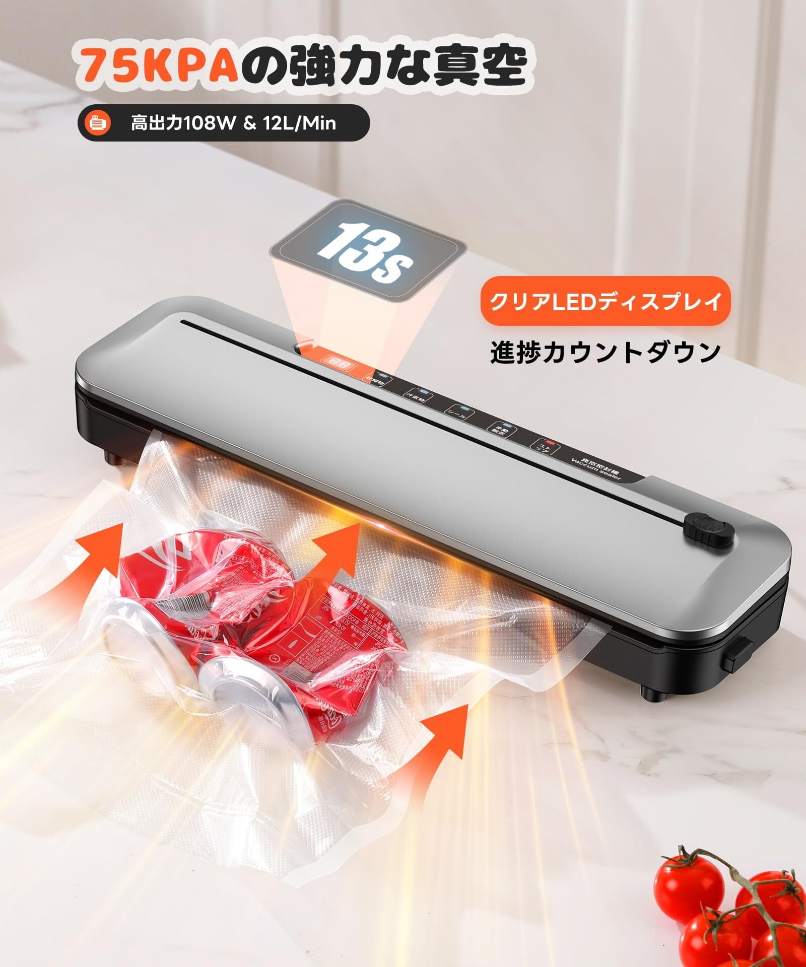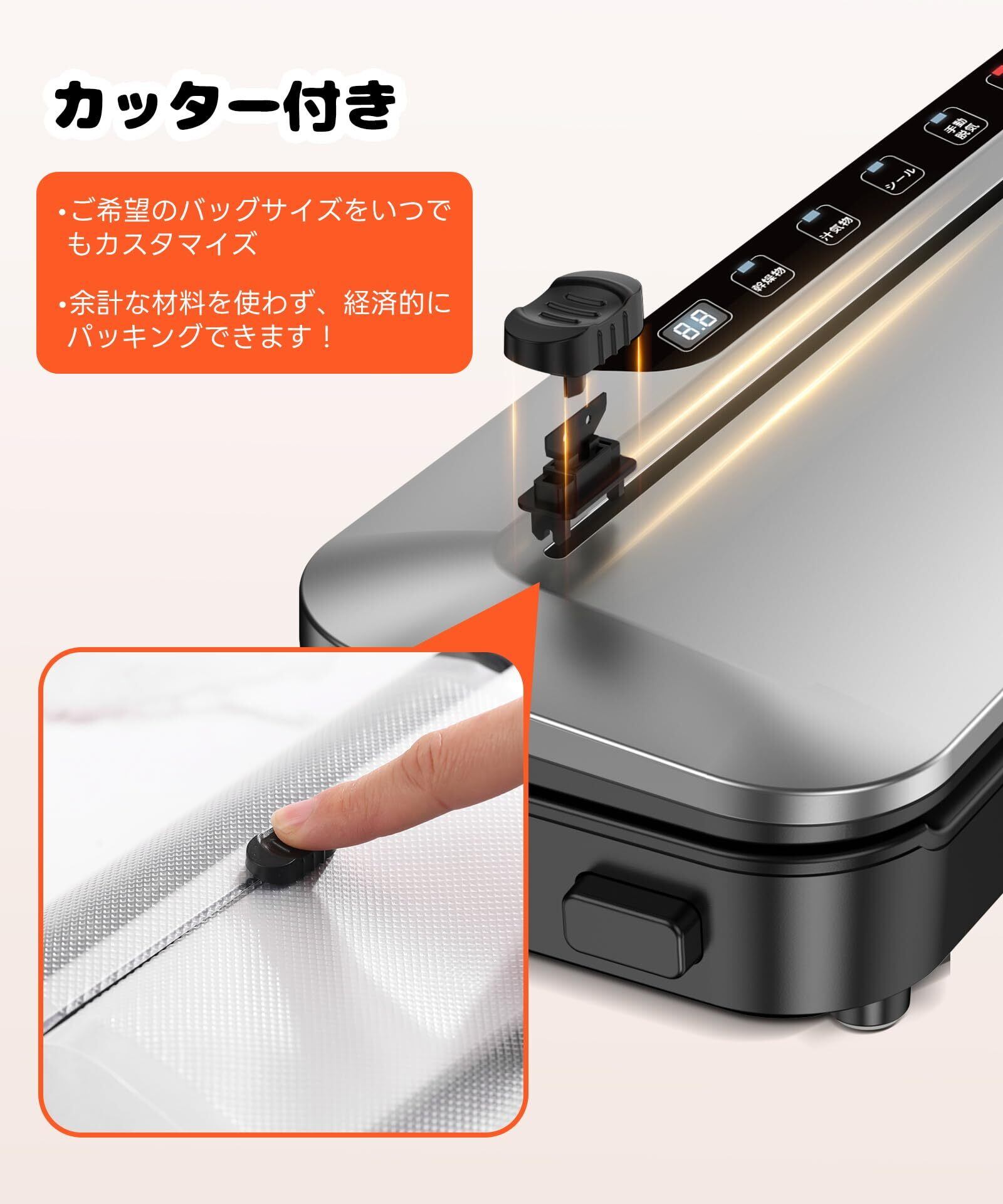 【75kPa強力な吸引力・内蔵カッター搭載・30cmシール長さ】108Wのフードセーバー最大75kPaの吸引力を実現!真空パック機は短時間で真空状態になり、食品の鮮度を瞬時に保持します。さらに、内蔵カッターで真空袋を自由なサイズにカットでき、ハサミなどの追加工具は不要。最大30cmのシール長さにより、大きな食材も真空パック可能。伝統的な方法より最大8倍長く新鮮さを保ち、出費や冷蔵庫のスペースを節約します。