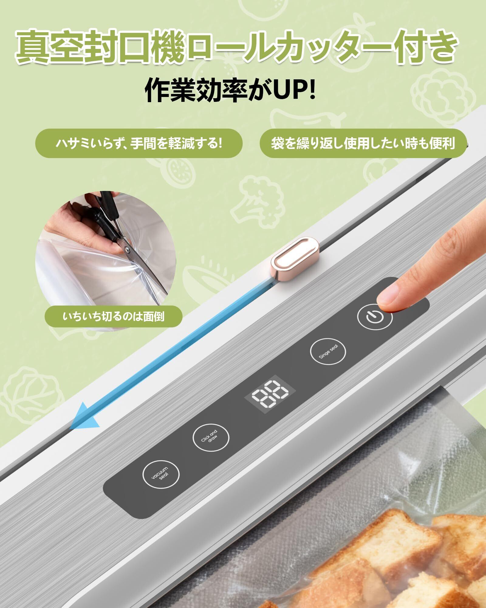 強力真空シールで鮮度をロック 技術・生産チームが長年研究を重ねた - 100kPa 最大真空圧を搭載!短時間で食品を効率的に脱気しつつ、真空機「食材の変形防止」と「賞味期限維持」を両立。真空包装機 湿気やほこりを遮断し、真空 パック機 真空パック機 酸化による劣化を抑えて鮮度を長持ちさせるため、忙しい日常で時間と効果の両面で便利な食品シーラーとしてお使いいただけます。