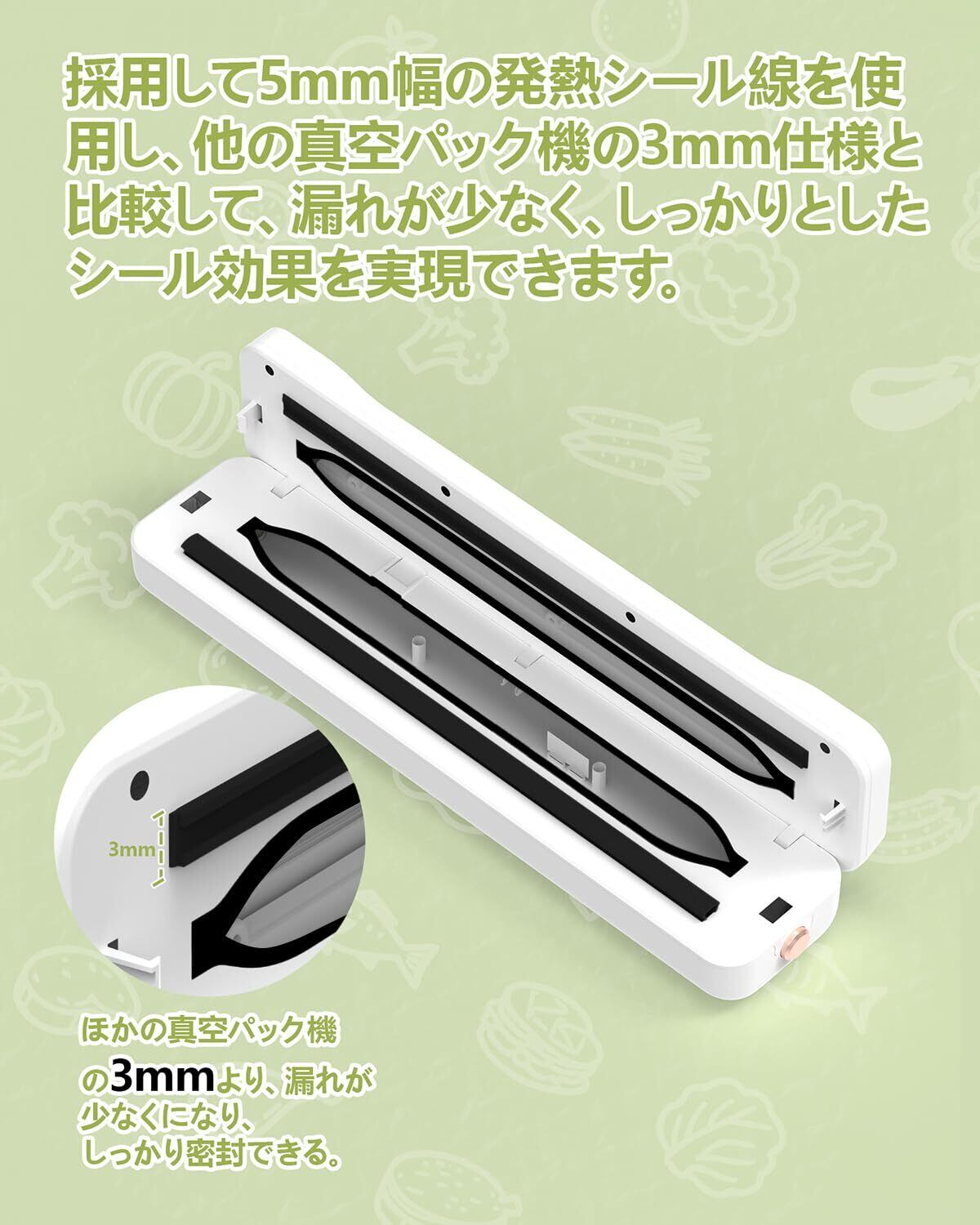 使用上の注意 真空バッグは平らに、機器に 5cm の深さまで正しく挿入してください(挿入不十分だと密封失敗する場合があります) シールが繰り返し失敗する場合は、機器内部が高温になっている可能性があるので、暫く休ませてから再試行してください 真空包装機 充電は ** 付属の 5V 充電ケーブル(元の充電器)** を使用してください(高電圧で機器が損傷する恐れがあります)フードシーラー 真空パック機
